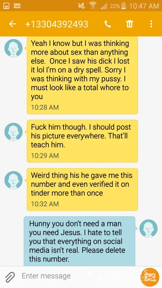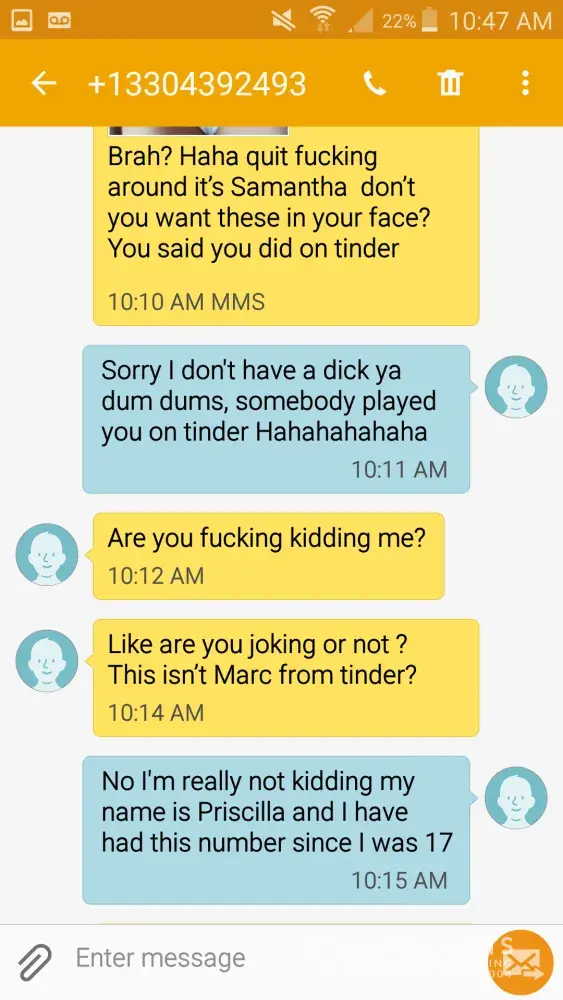 My name is Priscilla Cutlip and I would like to report a person who is using my cell phone number to catfish women. I've received several text messages from random people who send me inappropriate pictures. I do not use tinder nor do I have profile. The person giving out my cell phone number claims to be a man named Marc in the 330 area code. He's repeatedly giving my number out and I'd hate to take legal action against the site.