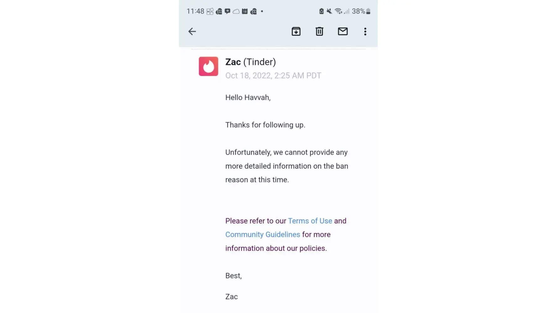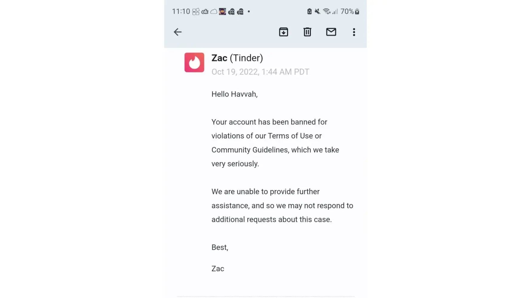 After contacting their 'support team' to try to understand why, their agents repeatedly responsed with the same, vague, copy-pasted response (lifted directly from their website with no change) that "your account has been banned from Tinder for violating our Terms of Use and/or Community Guidelines" and "we take violations of our policies seriously and don't offer an appeals process at this time. This decision is final, so you’ll no longer be able to access your account or create new accounts in the future."