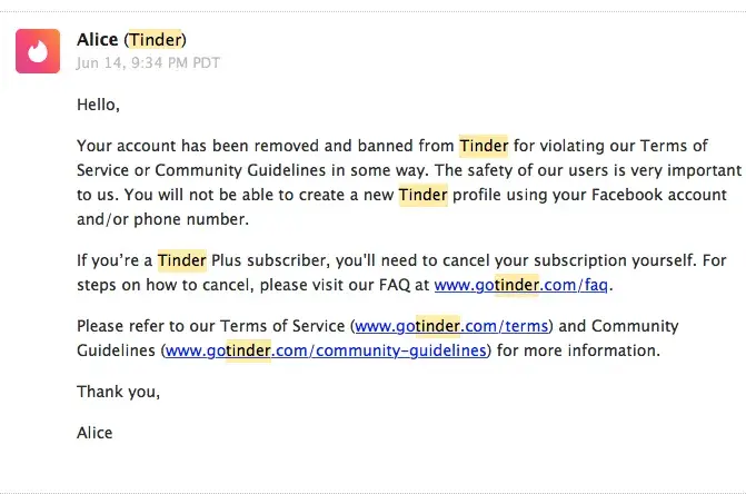 I emailed Tinder customer support, and heard back from someone named Alice who told me that my account has been "removed and banned from Tinder for violating our Terms of Service or Community Standards in some way."