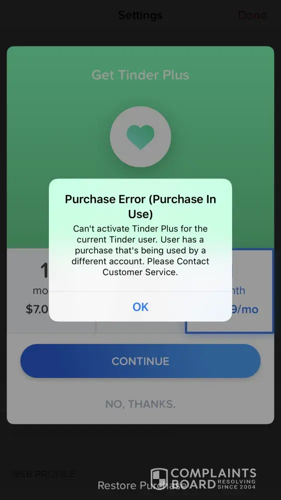 I'm complaining about tinder and their useless customer service, it took me to tell them I was going to the ombudsman before I got a reply within 10 minutes, I was happy to pay the £6 a month because I could afford that but to advertise monthly pricing and then taking the whole year in one installment is false advertising, I need that money for travel to college and meals at college but can't even get a reply as to how many days it will take to get my money refunded, I would think a big business like tinder would have a 24/7 customer service team, they take your money quick enough but you have to fight tooth and nail to get it back, false advertising is against the law in the UK and that is what advertising monthly payment amounts but taking a full year, if I had known that was how it works I would never have went near signing up.