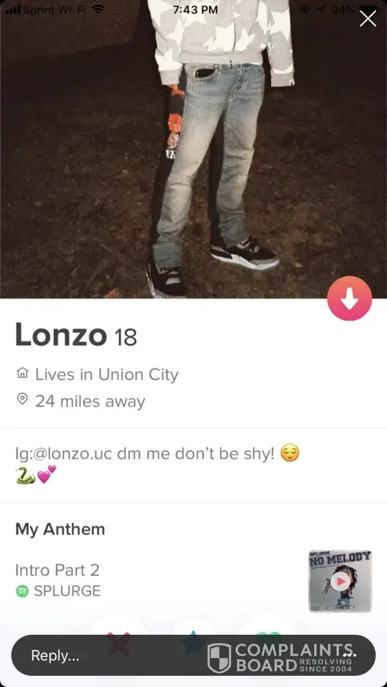 a perpetrator has created a fake tinder account, unlawfully using photos of my minor son's instagram account without his knowledge or permission.