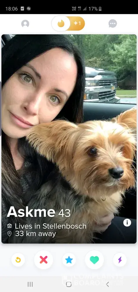 Lives in Stellenbosch is such a person. From the start it says 33km away. Stellenbosch much further away... but also whoever this person is, her or maybe a him they asking for money but firstly making you believe they so much in love with you ext... How many unsespecting guys are on Tinder that they already went through... As fake as you can get them... Also went under the name Paula. Asking for payments as "she needs cash for whatever"... Sure the emails already set up also and just changing where required. Fake! Even playing the feel sorry for me card also. Very well organised but many other people will fall for this also and they will all be paying... 😡