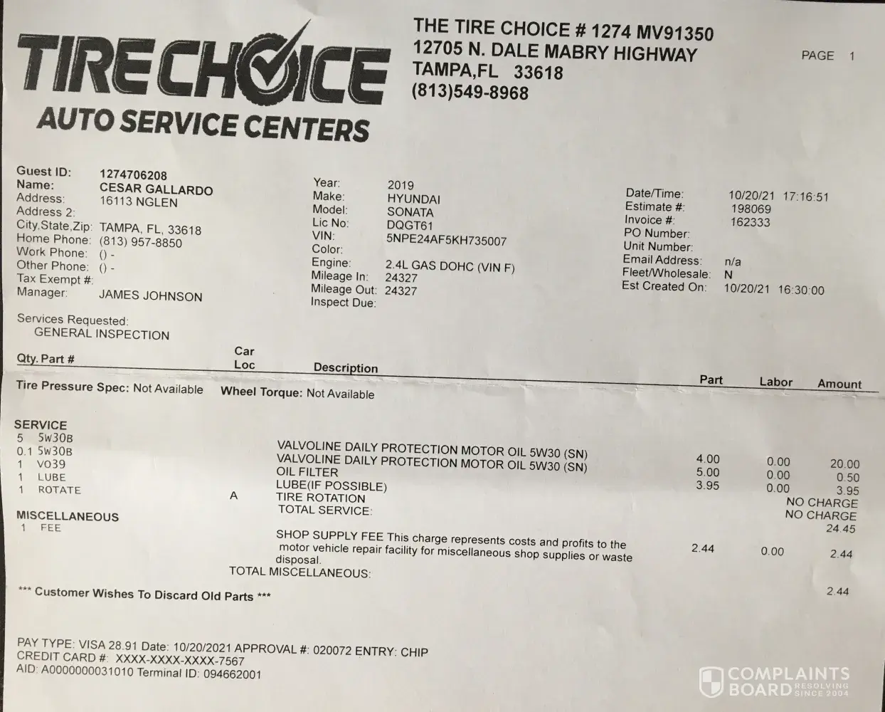 I have used the services of Tire Choice, Store #1274  MV91350 for the past four to five years for oil changes and tire rotation for my previous Mazda-Protégé and for my new 2019 Hyundai Sonata.