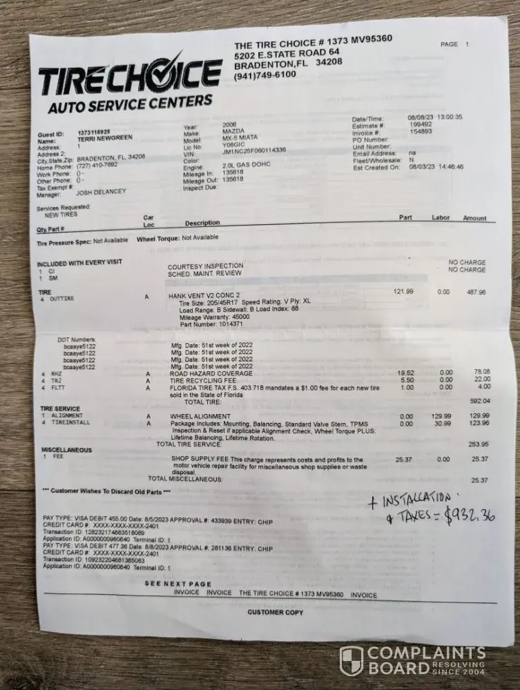 I contacted Tire Choice Wednesday 7/13 and told them I want a refund and they said they would get back to me. They never called back.