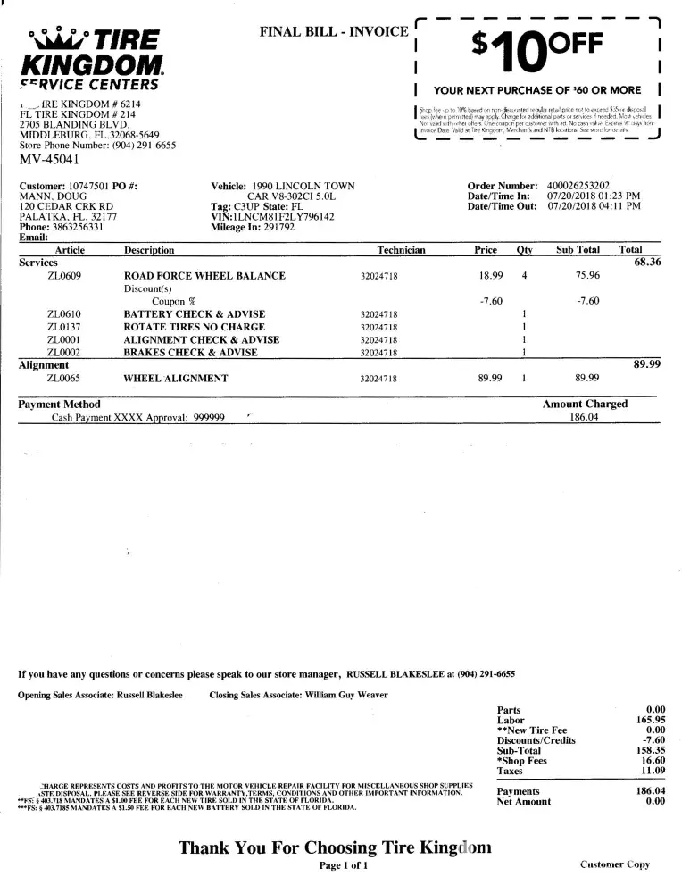 Attached is my paid receipt and work order. Since I paid cash, I'm asking for a refund of expense for tire balancing, $75.96 + taxes. Please forward check payment to me at my address of record so I may get this work performed correctly elsewhere. Thank You.