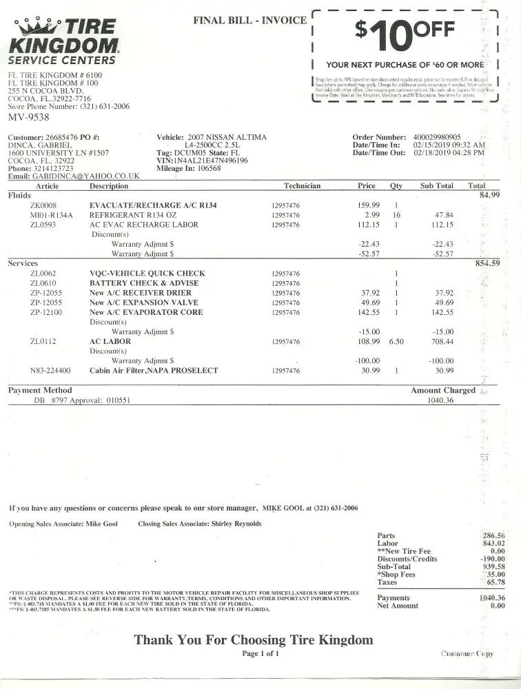 On Feb 15, 2019, in agreement with Mr. Mike from Tire Kingdom, Cocoa, Fl, I dropped of my Nissan Altima for replacing the evaporator.