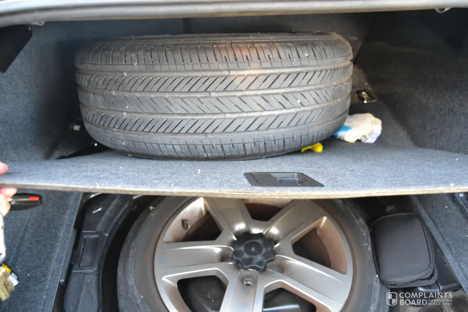 We specifically asked that the spare on the rear passenger side be removed and placed in the trunk and put the new tire on the rim in the trunk since the tire in the trunk had blown out and we had to put the spare on the car. Prior to leaving, we asked Jeff if he understood and wrote it down. He said he did.