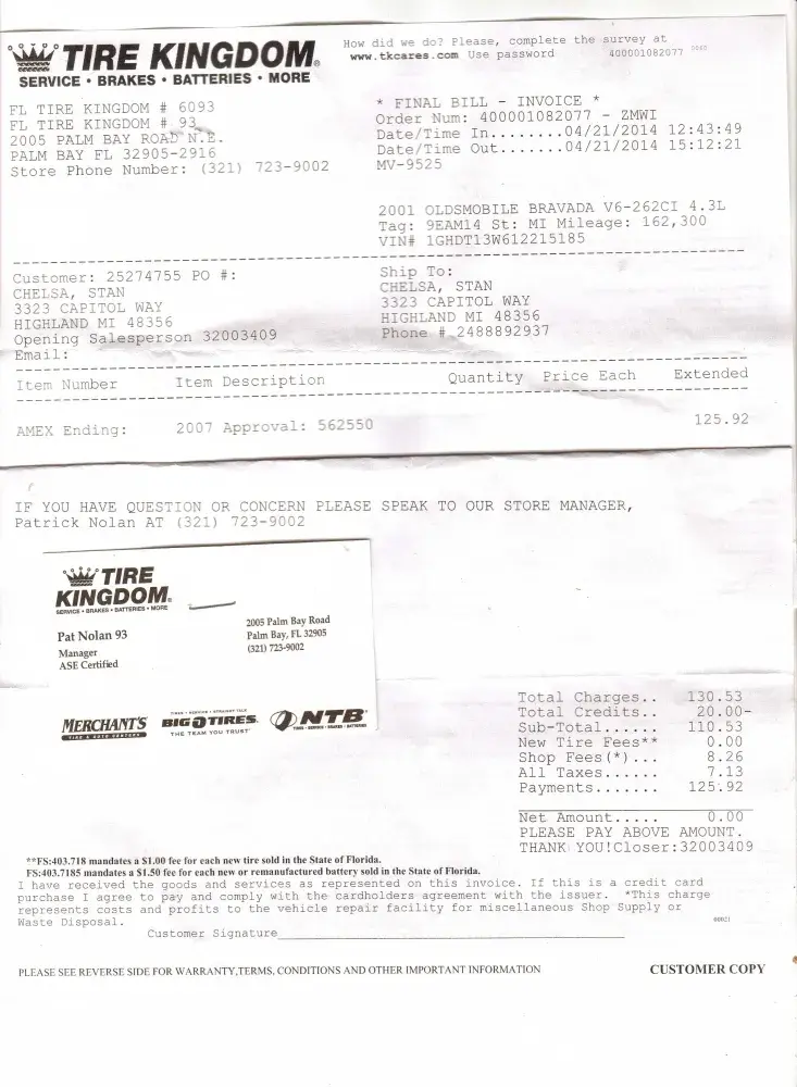 Due to the Check Engine coming on shortly after the installation of the defective fuel filter ANY problem with my “fuel system” will be repaired at your companies cost. All of the rear brake lines and the fuel filter were dangling and exposed to excessive vibrations. You don’t just throw out “rusty plastic parts.” Tire Kingdom is supposed to give the owner all parts taken off the vehicle, minus core exchanges. My vehicle could have blown up. There are several Federal Laws, FDOT, GDOT, National Highway Traffic Safe ty and other associations typically impose large fines to companies that allow this, that I have dealt with. I can’t imagine the fall out of contacting the media over this! If this is not resolved I will go public with this safety issue about your corporation.