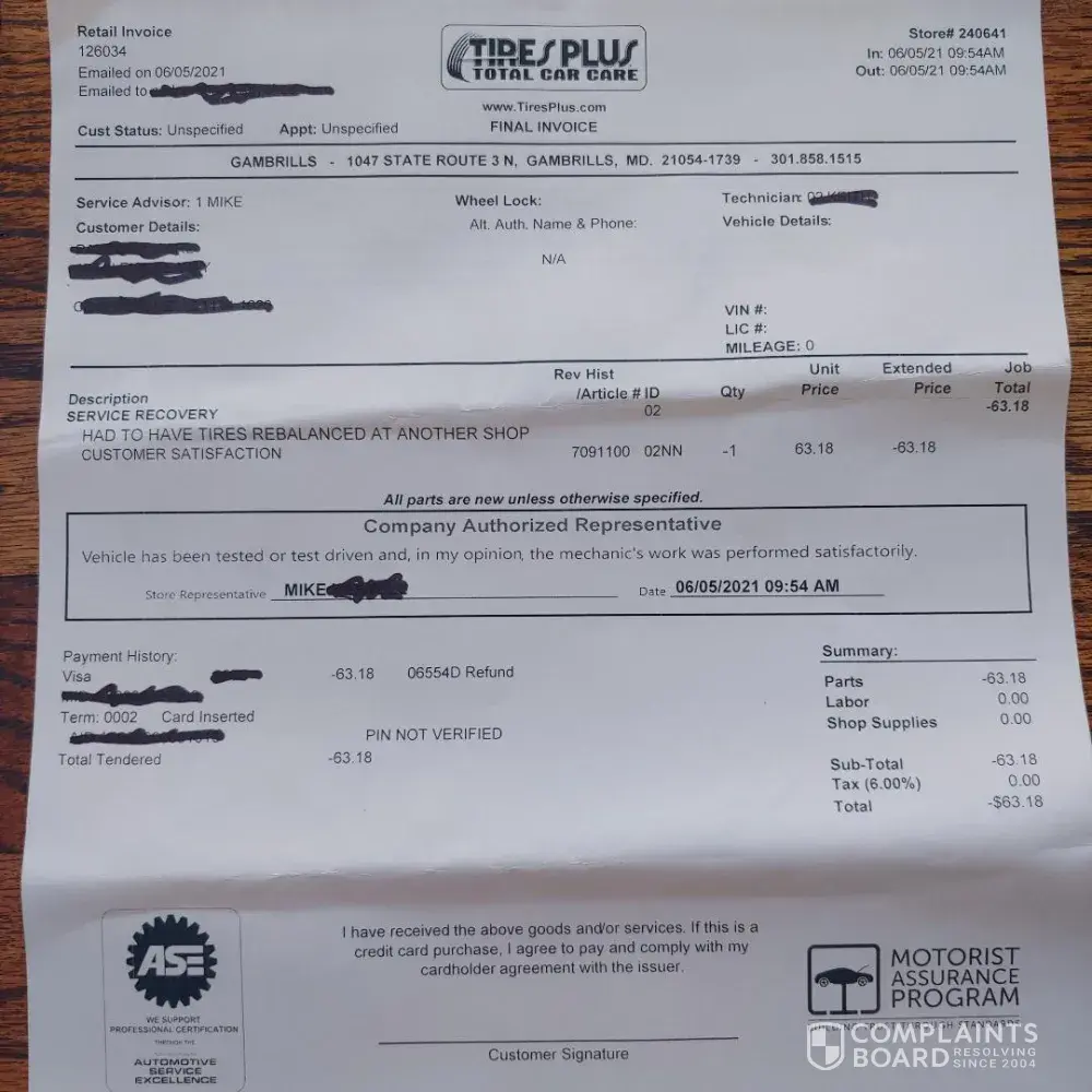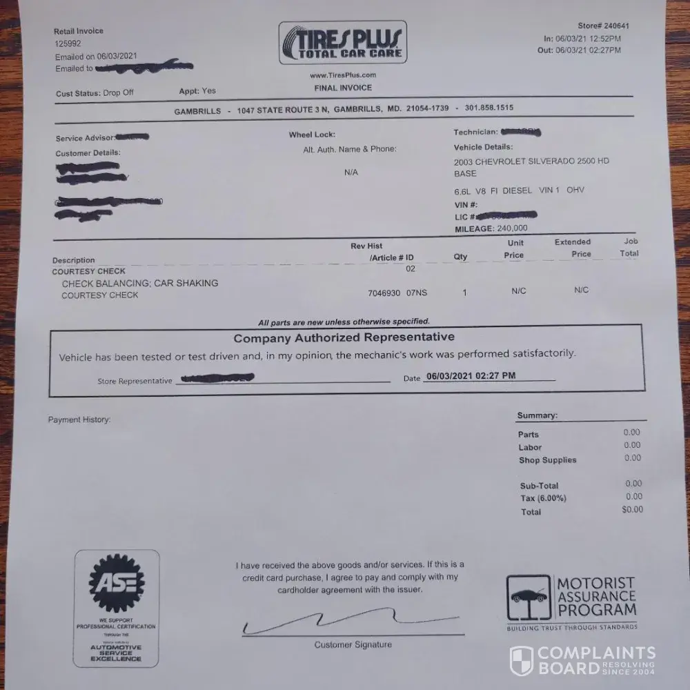 Read full complainttire service