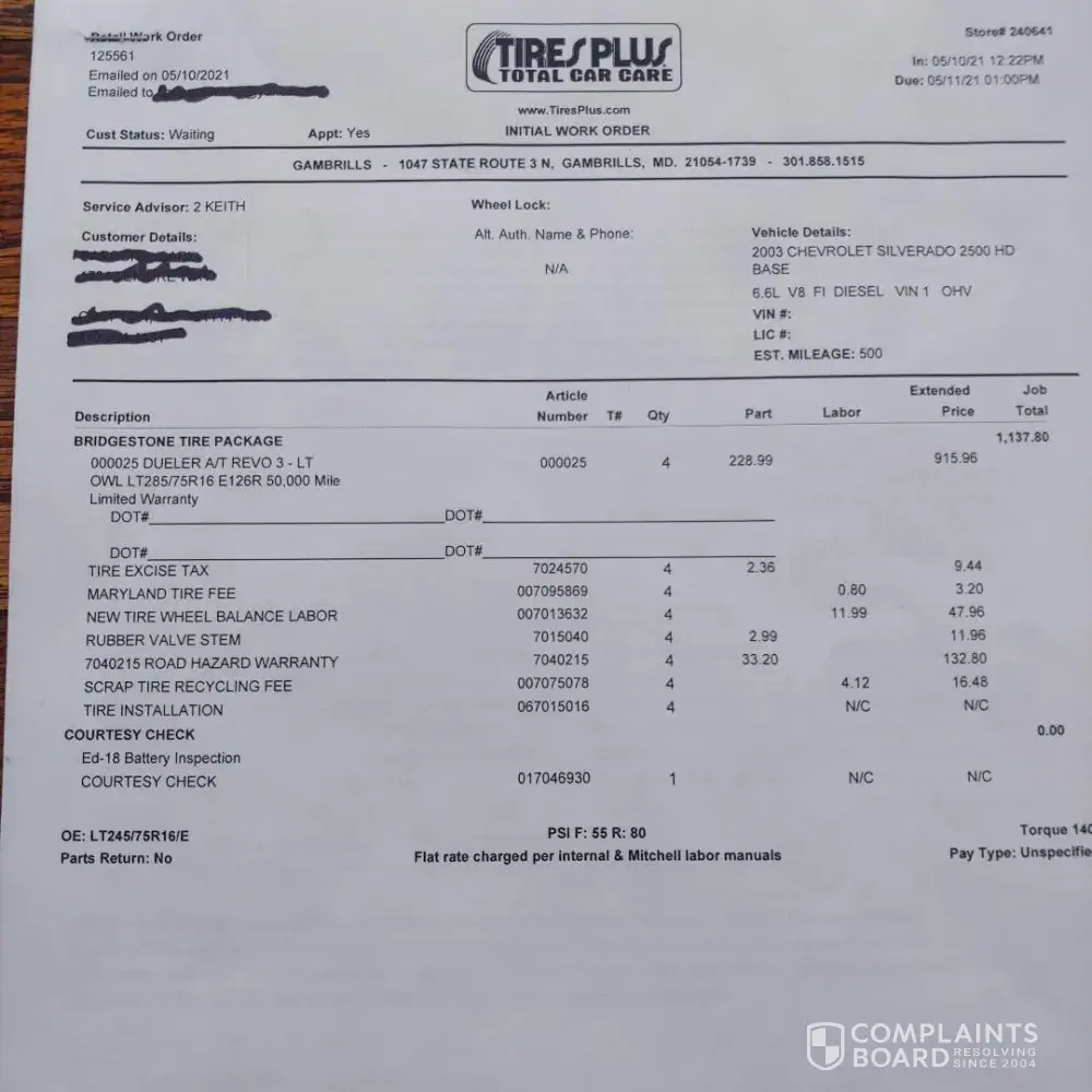 Tires Plus Store #240641 Tires Plus Service Date; 5/10/2021 • Bridgestone Tire Package Installation Tires Plus Service Date; 6/3/2021 • Front Tires Shaking, requested tire rebalance • Dropped off truck, received call that they don't have the tools to do my balance correctly, that they did the best they could when they were installed. Someone wa...