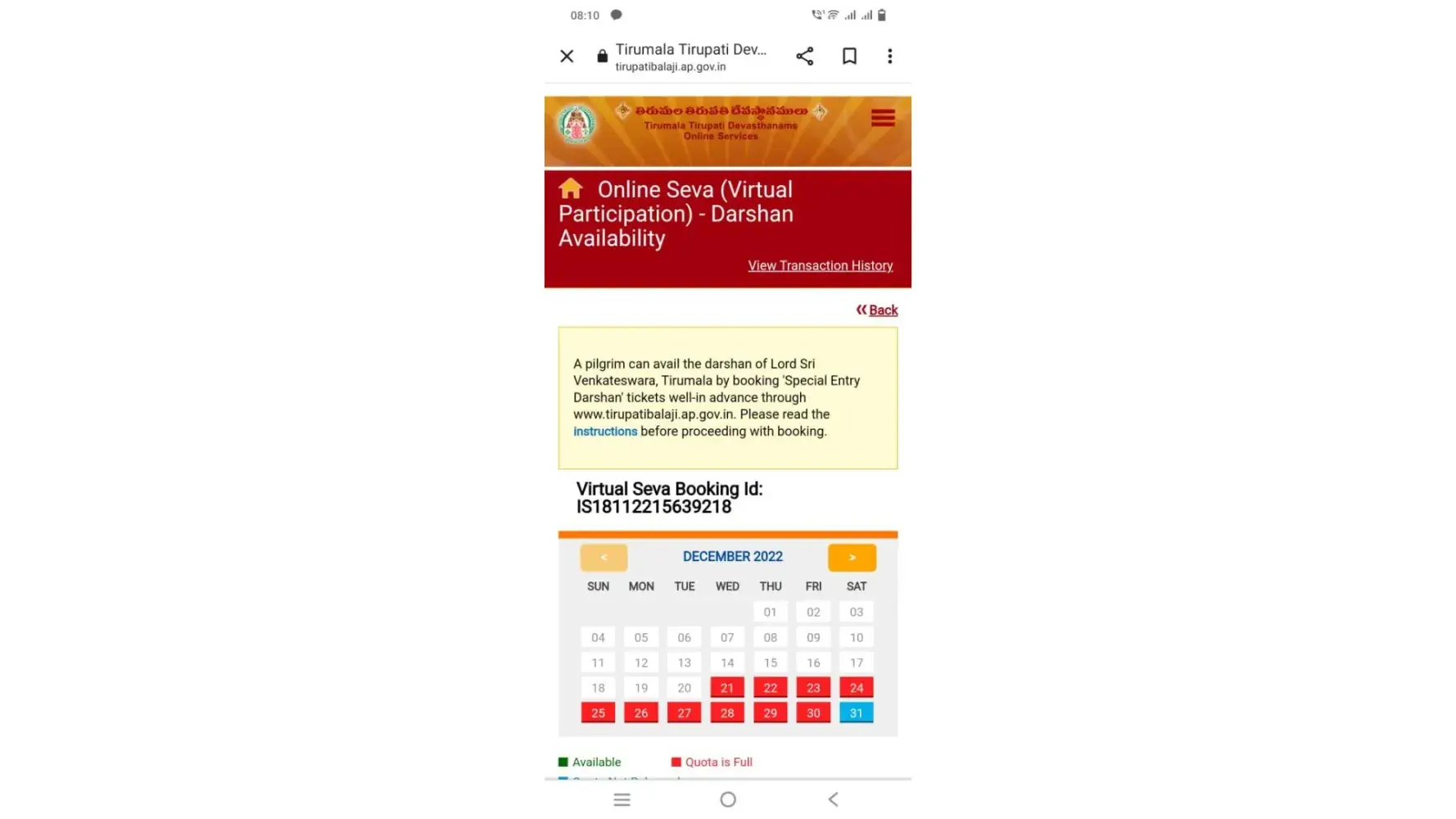 virtual seva booking id IS18112215639218