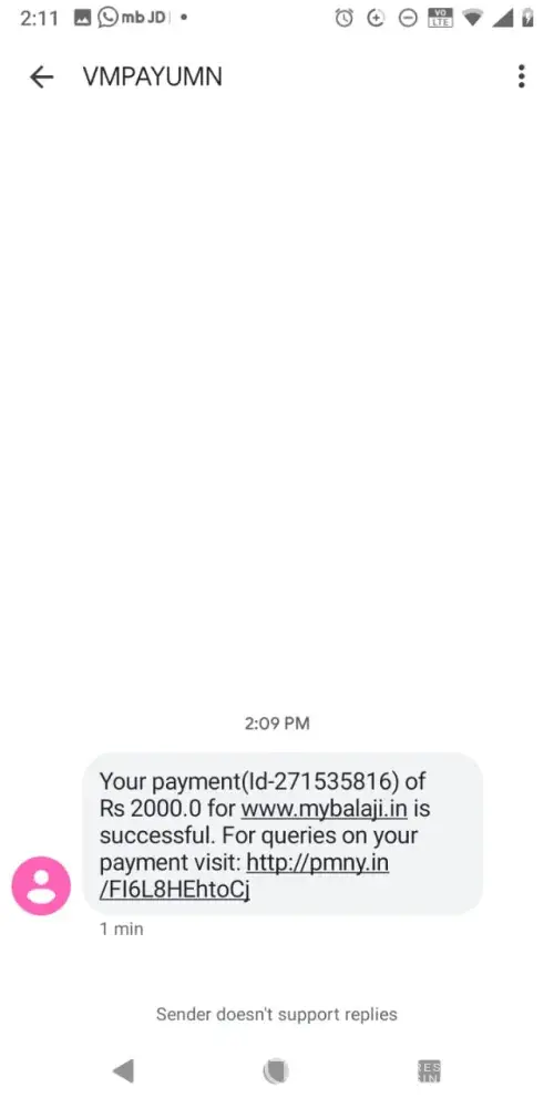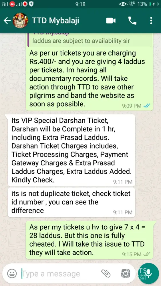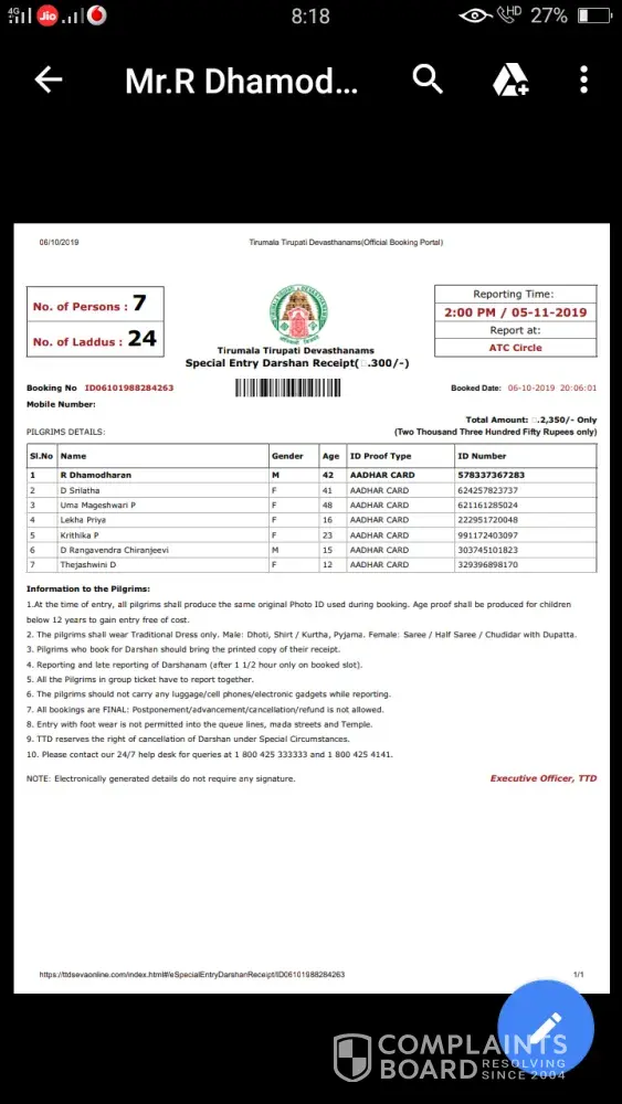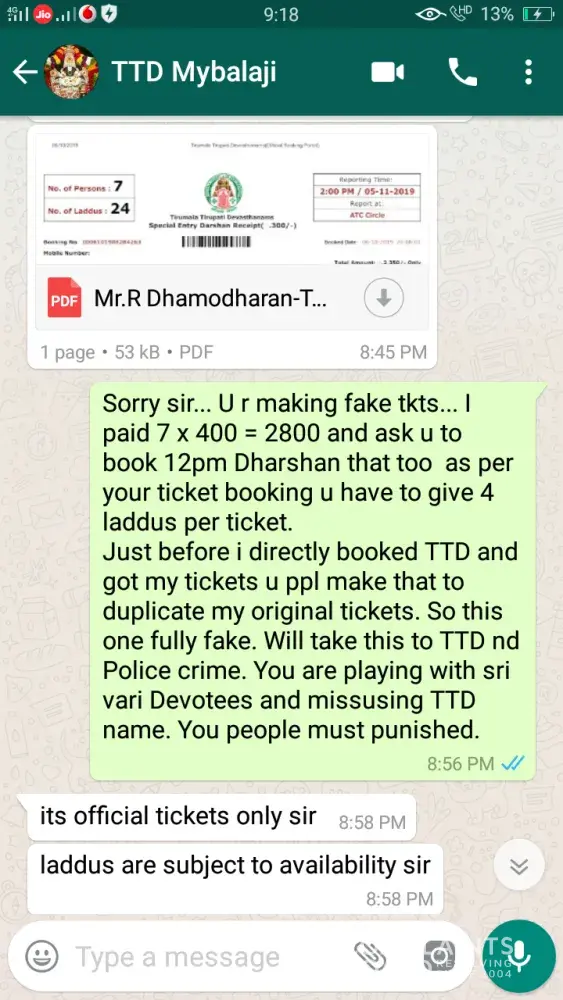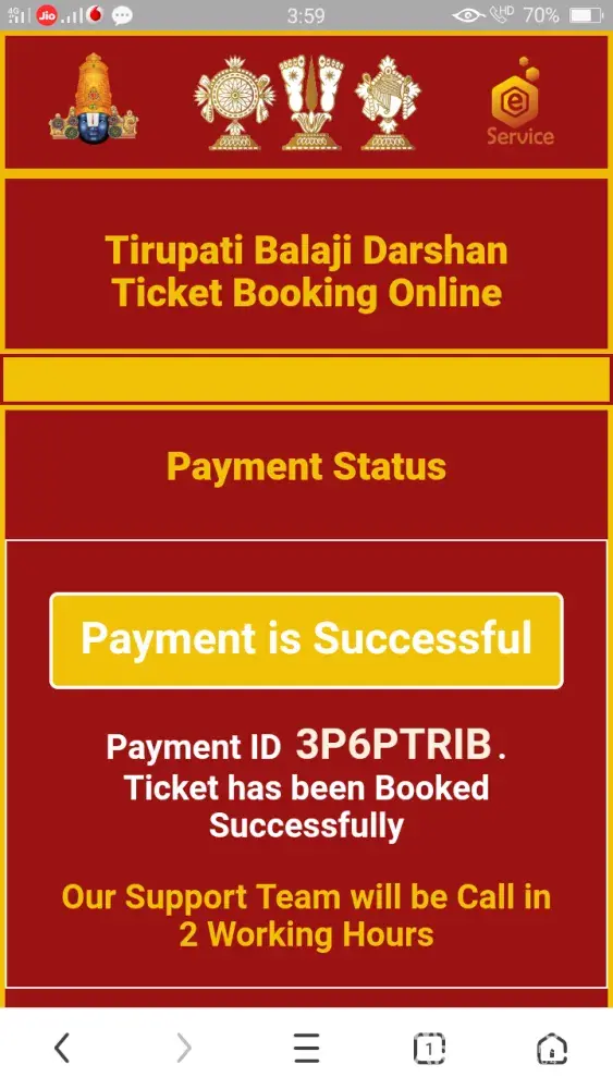 I was booking for e special entry darshan through ttd on line website and was directed to www. balaji.in on 19 august 2019. I furnished all details as per sms received and also messages on whatsapp. On filing all details like Name and adhar card for all the 9 members, they confirmed that tickets are available for the confirmed slot my requirement. I got message that, ttd support person Mr Sureshkumar can be contacted for any details on numbers 8489993053 / 9789795492. Then was directed to payment though payumoney for Rs 3600/- only. The payment was made thruough credit card, then screen appeared as payment successful. Payment ID TRHOWOGE appeared on screen saying support team will call in 2 hours. since then I have called 100 times from last 6 days but no response. Then approached TTD, they said It is fake website. They also told they are getting lot of complaints from customers daily. Although money is gone, but question remains as to why TTd has not taken action against this duplicate website. Everyday hundreds of people are getting fooled and loosing money. The IP address on investigation was found to be in Singapore. Also lodged police complaint but no solution till date. please be aware of such fake websites and ttd must strongly advertise against not to use such websites and automatically guide to proper on-line booking.