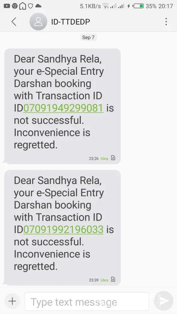 We have done the payment for TTD Seva booking in the official app for 5times. Only 1 transaction was successful. But the amount has been debited for 5 transactions. So, could you please verify the payments and return the money for failed transactions. Transactions held b/w timing : 11:26AM-01:09PM on 02/08/2019.