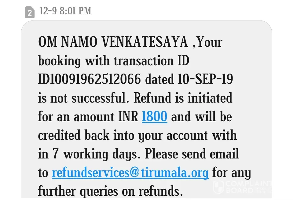 rs 1800 on 10 th sept. But the ticket was not caught.Their was a failure message came. My transaction id is-id10091962512066. Today is 19th september. But till now i am not refund my money or any type of help from ttd. So kindly solve my problem.