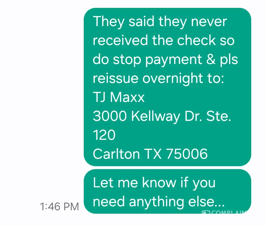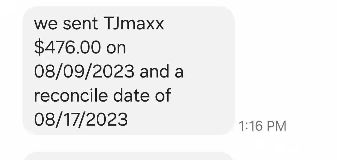 Back in September 2023 I got a debt consolidation loan from my bank. TJX was one that was paid off. I have been getting regular emails and or mail saying I still owe them. My bank, Community Credit Union sent 2 checks. I asked them to void the first one as I told them it was apparently not received. They reissued another one in the amount of $476.00 to: TJ...