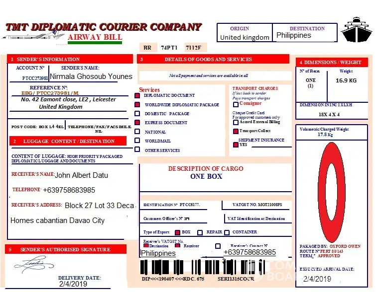 I am the Manager of Delivery Security Company and we received your information's from Mrs. Nirmala Ghosoub Younes, and she give instruction to us, to delivery her consignment box to you in your Country, however I want to let you know that your consignment box will depart from London on 4th of February to Philippines.