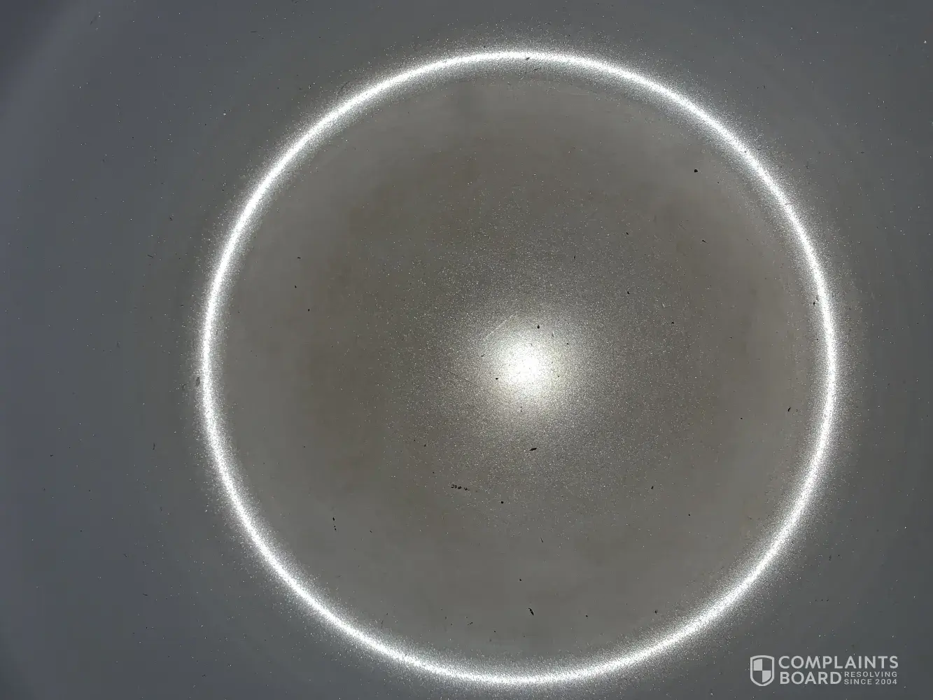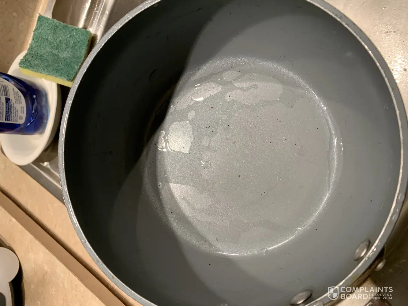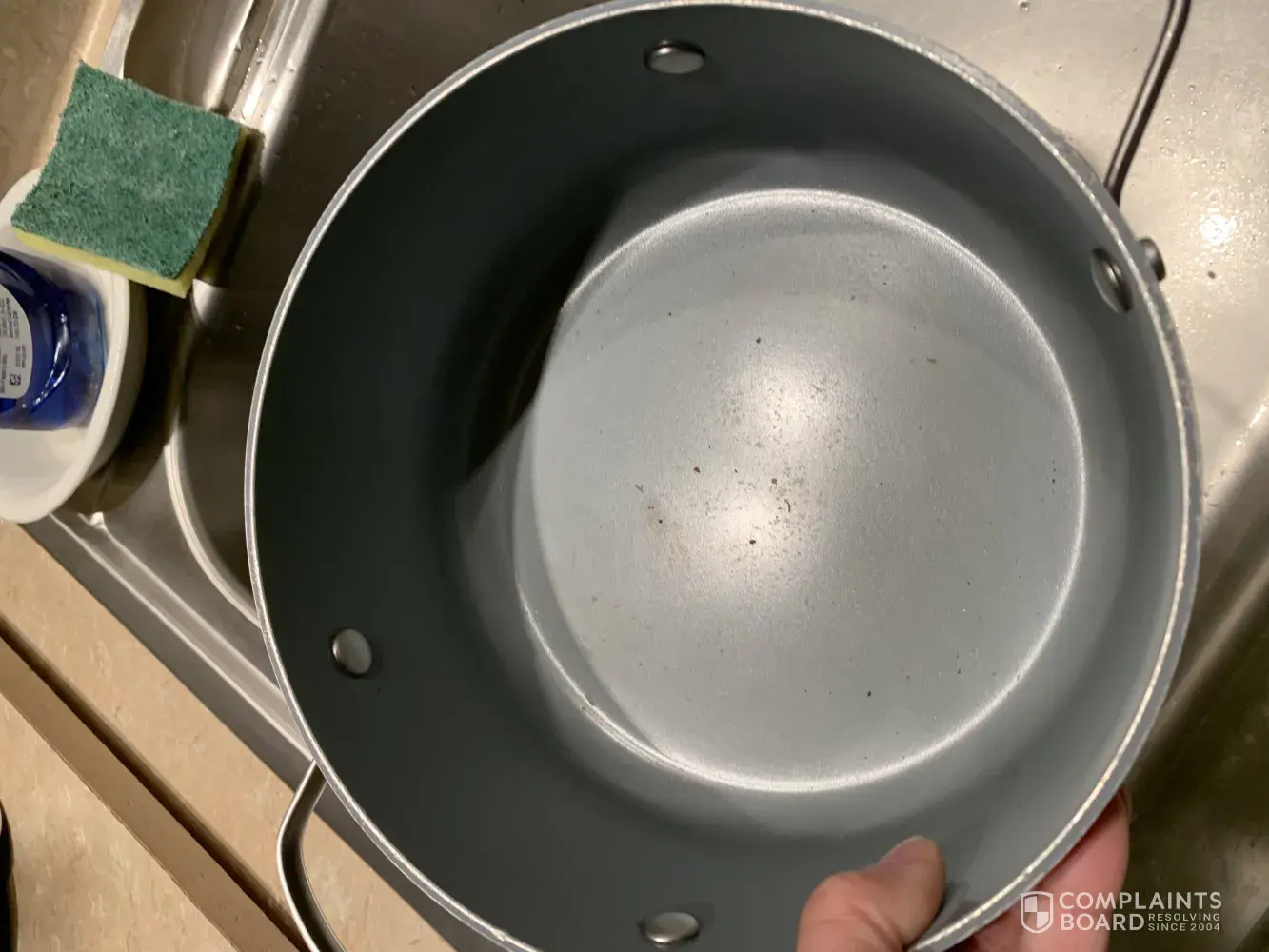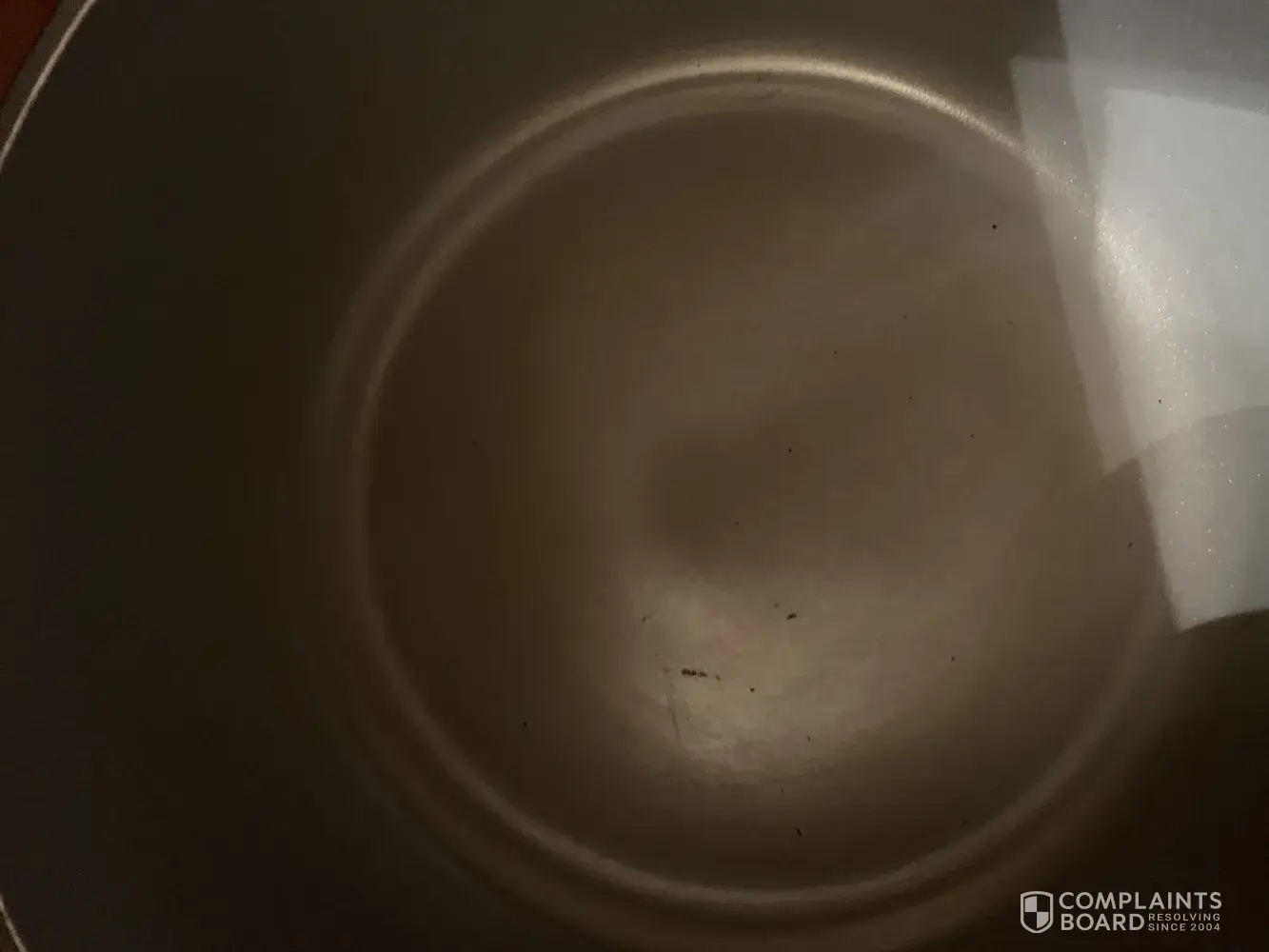 AS you can see the 1st picture it has all the white chip marks on the bottom of the pot and the 2nd picture shows how the coating is pealing from the edge on the top of the pots.