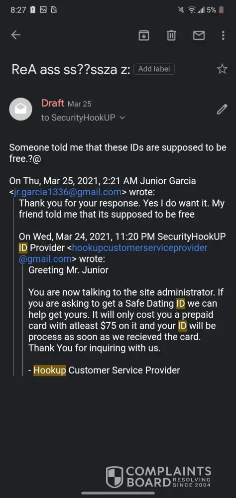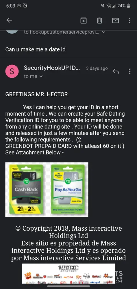 I was told by one of the girls I met on an online dating site that I can get my hookup id from her admin so I contacted them and he told my I needed a geendot visa prepaid card with 75.00 on it. Then I spoke to hom again and said I needed 2 of them with 60.00 on each one so I went n bought them I sent if to him and he emailed me again telling me my id was on hold until I send 2 more cards with 60 on each one again wtf hell no I want my id now or my refund.