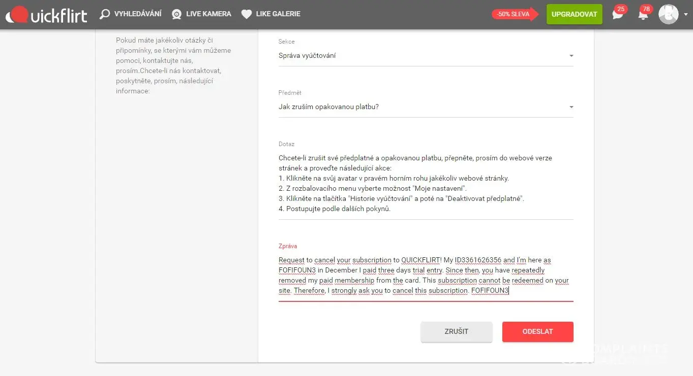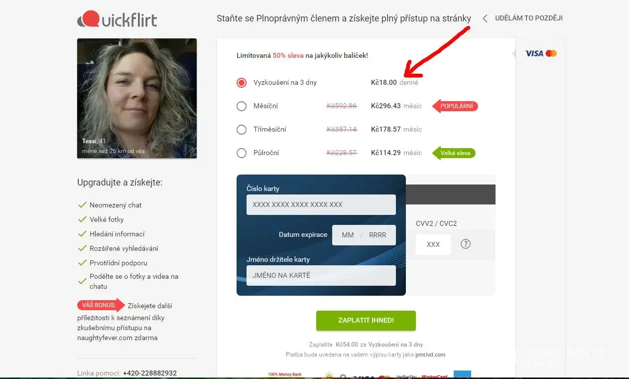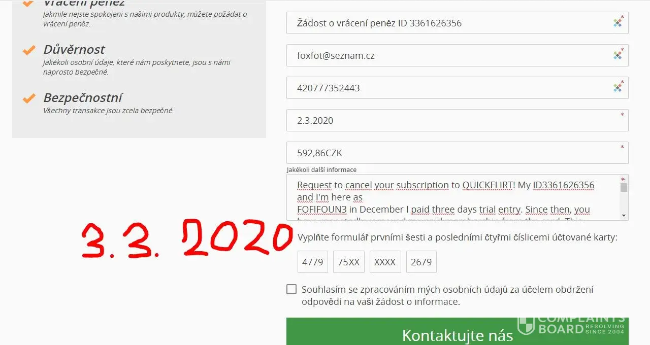 The brand of this QUICK FLIRT holding on the eye offers familiarization for the purpose of flirt. Photos of women are blurred to see them sharp you have to pay. I chose to try for three days for 18CZK. The following month, they took CZK 592.86 from my card, and so far they took over CZK 2000 from my account. This "summoning" is automatic and I did not agree to it ! This subscription cannot be canceled after you sign in to the site. I am requesting a refund for my email [protected]@seznam.cz