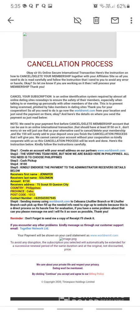 As explained in our Safe Dating tips section, all illegal advertisements, redirections to other sites where you have to pay, and asking for credit card details or money – these are scammers' most frequent activities. We do not recommend you provide your contact details (email address or phone number) to those members you have only just started to talk to. As our members join the site for communication with other people, our Customer Support constantly restricts the activity of scammers' profiles. We can, through a variety of tools and moderator departments make our best efforts to protect you from scammers on the site, but we cannot do that if you continue to have conversations by phone, email or instant messenger or any other means off-site where we cannot log communications and monitor them.