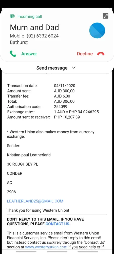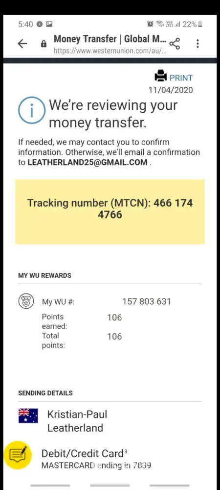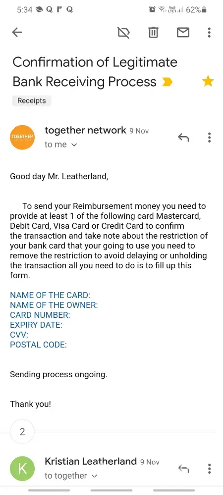 investigating the receivers coz James even forged a letter from his boss but was just forged by himself so the guy that owns the company is out to prosecute everyone involved. He has as I do have copies of all things that where done and said by every body that dealt with me .. there is 4 other conversations I have where there telling me to give them my banks crn. Login details very persistent even tho I said it was illegal.. it didn't worry them at all .. there was just one after the other .. even upto last night a new girl tried and tried to get bank codes so she could get into my accounts.. I had to tell her no and logout but I kept getting messages from bank . This happened so often that they stopped my internet banking .. 4 new cards in 4 weeks ..