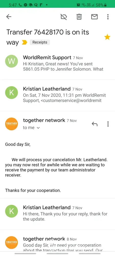 Please see attached. I joined the site as indicated on attachment. You get verified, tied to one girl. You aren't allowed to look at any of your websites since you and a girl are connected to each other only. So I have to pay to join and $300 for first date to be at a hotel for 2 nights. Well we haven't met yet, always a reason for more money before we meet. The girl is Elise Lopes. We work with a representative called a verifyer who is supposed to finalize our documentation so we can meet. I have been promised this would be completed at least three times after paying $150 to $350 for Elise's obligations. Then it never gets completed so we can't meet. She says she currently owes $300. If I pay it for her then supposedly we can finally meet. I have spent a total of $3500 for Elise Lopes. I want to make sure she is real and we will meet after payment. The verifyer we have worked with has an email of 2gethernetwork@gmail.com and supervisor has email of verifierslead123@gmail.com. All I want is to meet Elise so has this all been real or is someone using Together Networks as their prop to pull off a scam. Brett VanNieuwenhuise, [protected], [protected]@gmail.com. Thank you for your time to answer my concern.