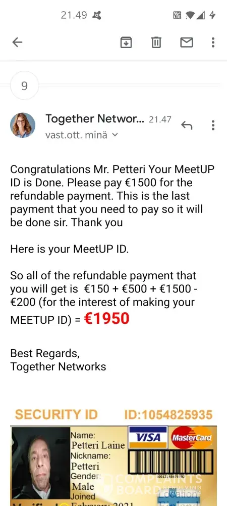 I was told by a girl I need this ID in order to meet her so being nieve as I am I did then i was talking to an admin from together networks that said i need to pay $1400 for the ID and delivery and i will get my refunable money back upon delivery. I've paid $1, 150 towards it being a fool and then realised that this is some kind of scam.