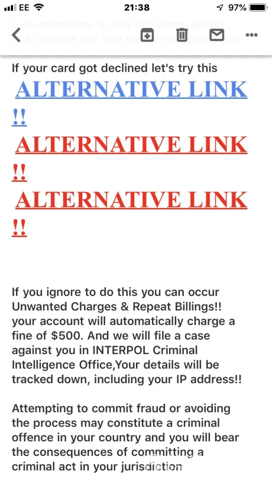 I have tried to cancel my membership and then I've got an email saying that they will fine me £500 if I don't continue the process. This is surely a scam as I have refused to pay any more money. Someone called CammyPleasure something like that is threatening to send a complaint to arrest me for crimes.