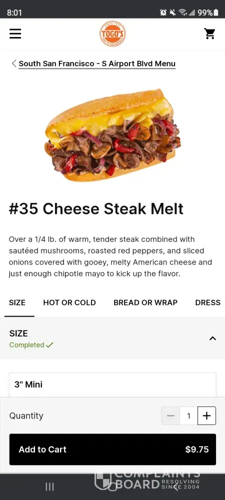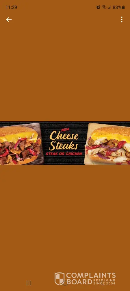 I purchased 2 sandwiches that were (as advertised) steak and cheese etc. Instead I was given Roast Beef instead of steak. When I sent a email to Togo's, the response was "it's always Roast Beef we do not have steak" The middle photo shows what I received. Never again.