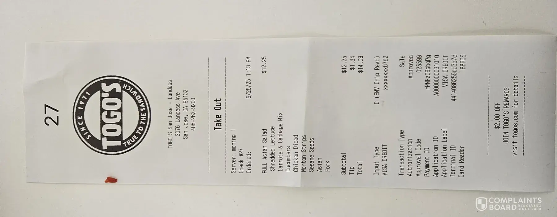 On August 01, 2022 At 14:54 pm, I sent my fiancee out to a Togo sandwich located at 3455 Sonoma Blvd. #10 Vallejo, California 94590 ph# [protected] Prepared By Server Balwinder D. on ticket #40 who took and prepared this short order, and short being an understatement, to get me a bite to eat.