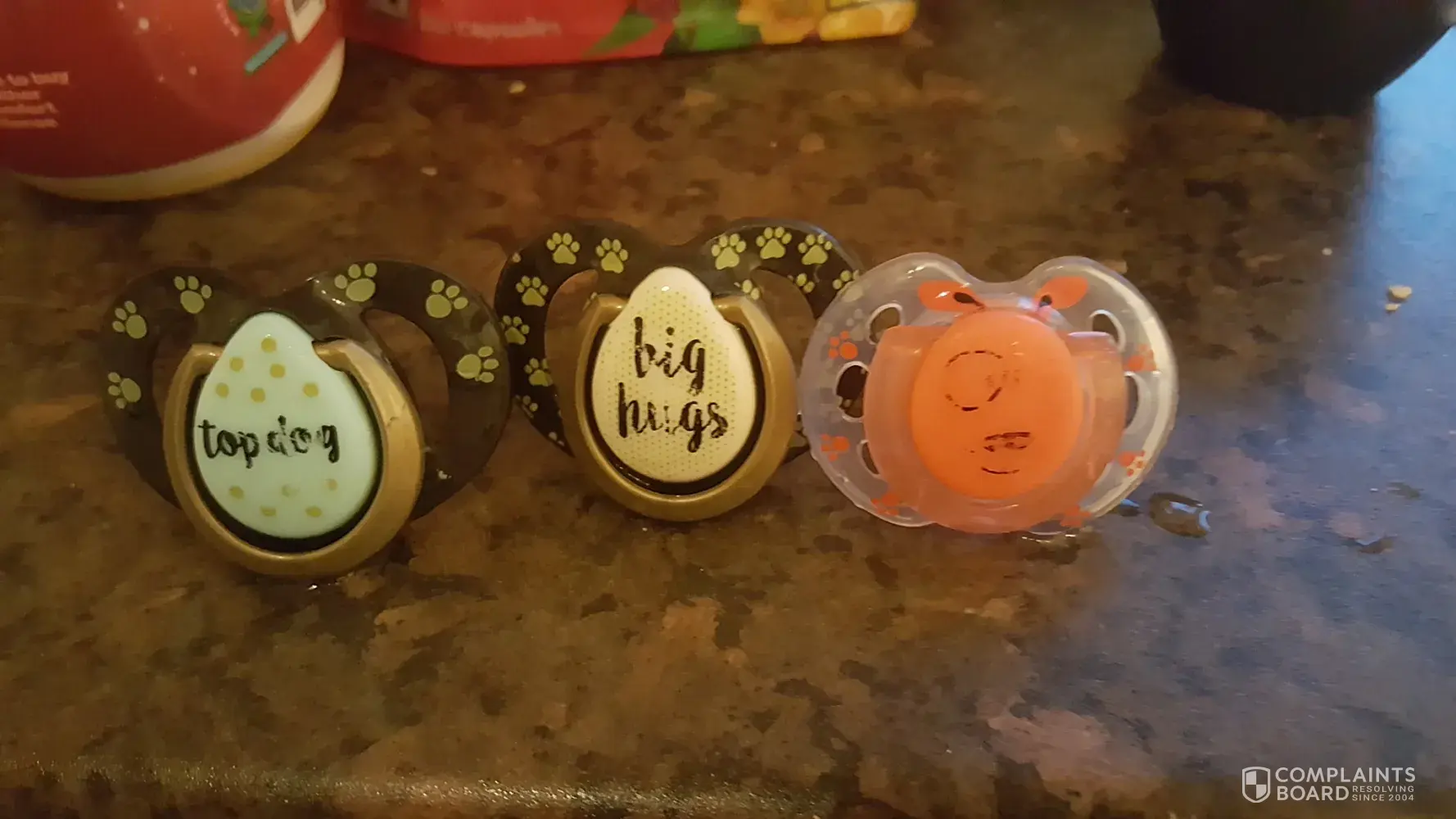 I have always used your soothers for my little girl. I was very disappointed when I bought two of your "glow in the dark" night time soothers as they didn't glow and had no instructions as to advise if they would need 'charging' similar to solar panels. Recently I bought two of your day time soothers and once again I am disappointed as the print is coming off (see attached photo). Nuby re entry did an offer of a free soother, when it arrived it came with a 50% off voucher when shopping online. Please replace my products.