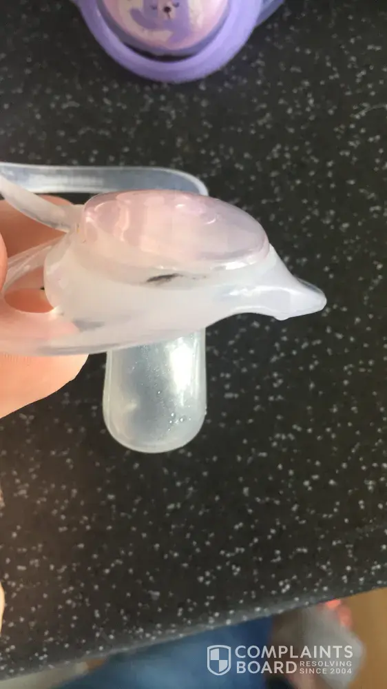 I brought these dummy's about four weeks ago we have never had a problem with any of these products and have always used them, today I noticed the inside of the clear bit looked wet so upon further inspection I noticed a massive spilt going through the top of this dummy ! I am horrified as if I had not seen this my daughter could have choked! For the money we as parents have to spend on these products I am disgusted to find this as there are only 4 weeks old and been used for 2 weeks I will be making a public announcement about the rubbish quality of this product if this complaint is not resolved