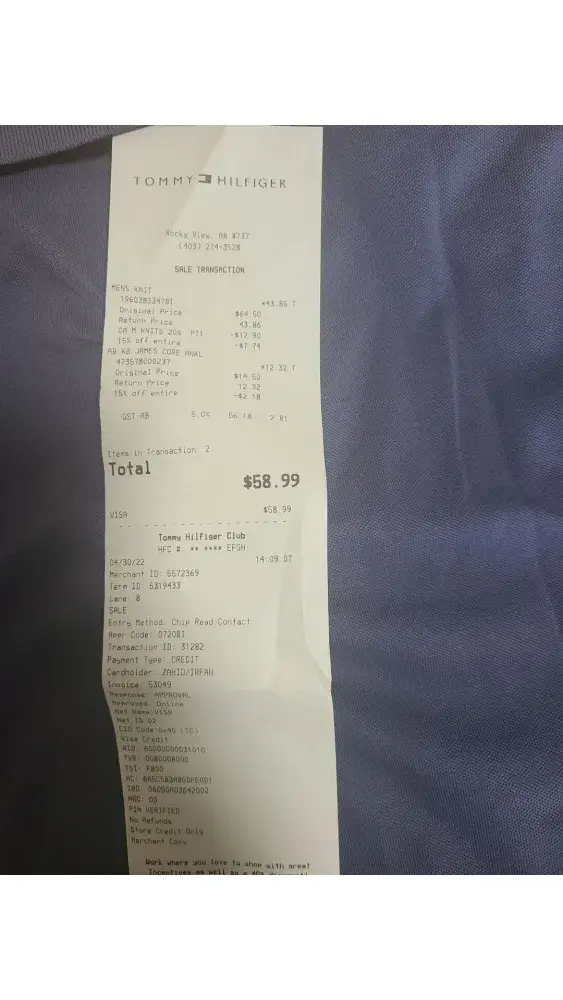 I bought a shirt few days ago from one of tommy location in calgary alberta my shirt was ripped from the back which i didnot notice when i bought it i was hoping if i can get it exchanged term id 5319433 appr code 53049 trans 53049 date 30-04-22 cross iron mall calgary alberta canada