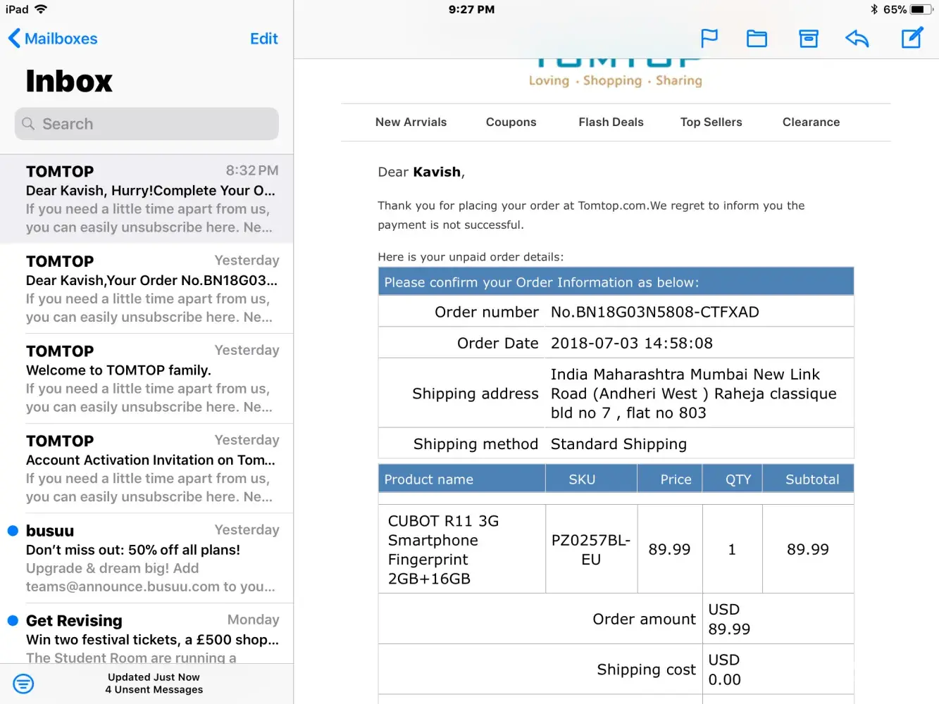 I had ordered a phone on the website and the phones name is cubot R11 3G smartphone worth in rupees 6210 and I got email saying your order has been successful and also from my bank account that much money was removed and next day I got another email saying your order is unsuccessful pls pay as soon as possible and my money is gone from the account so pls contact me as soon as possible it's very urgent.