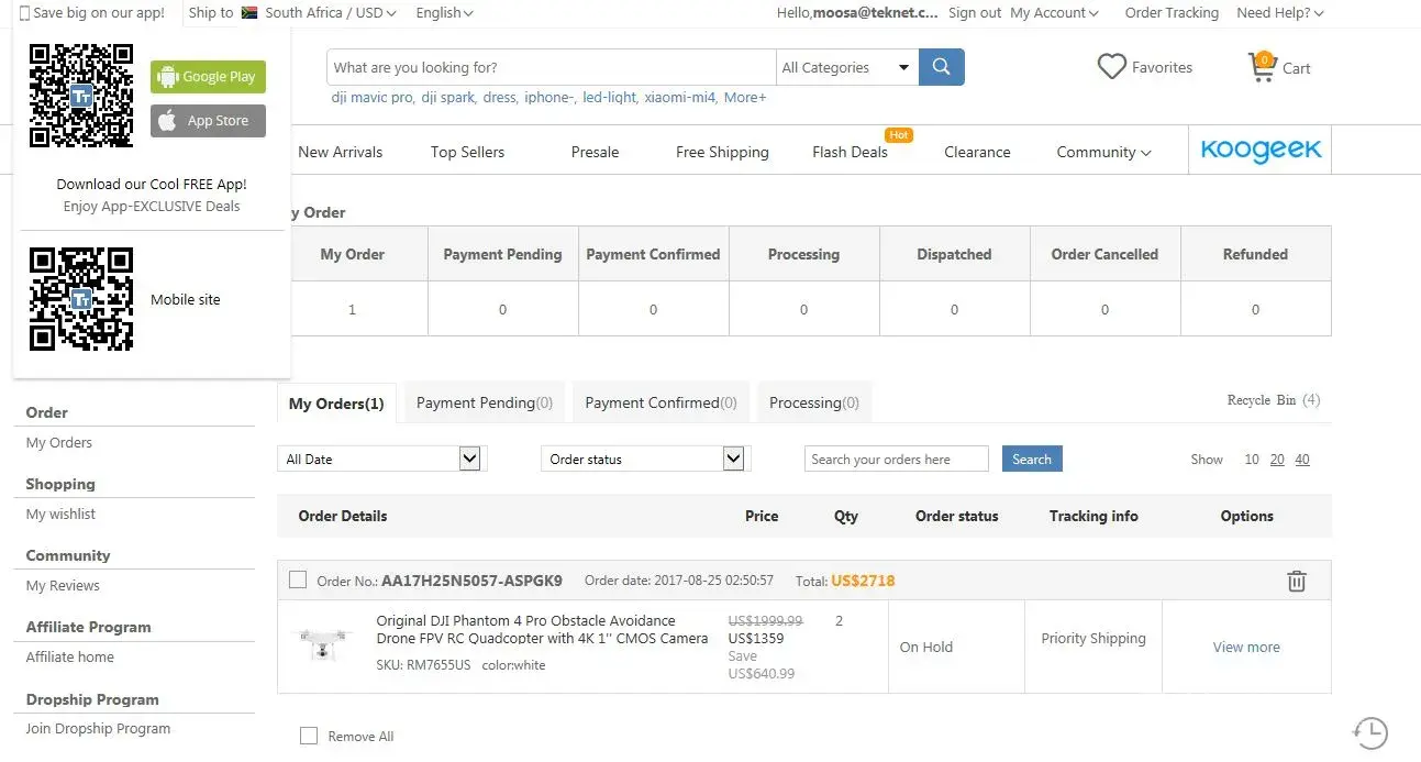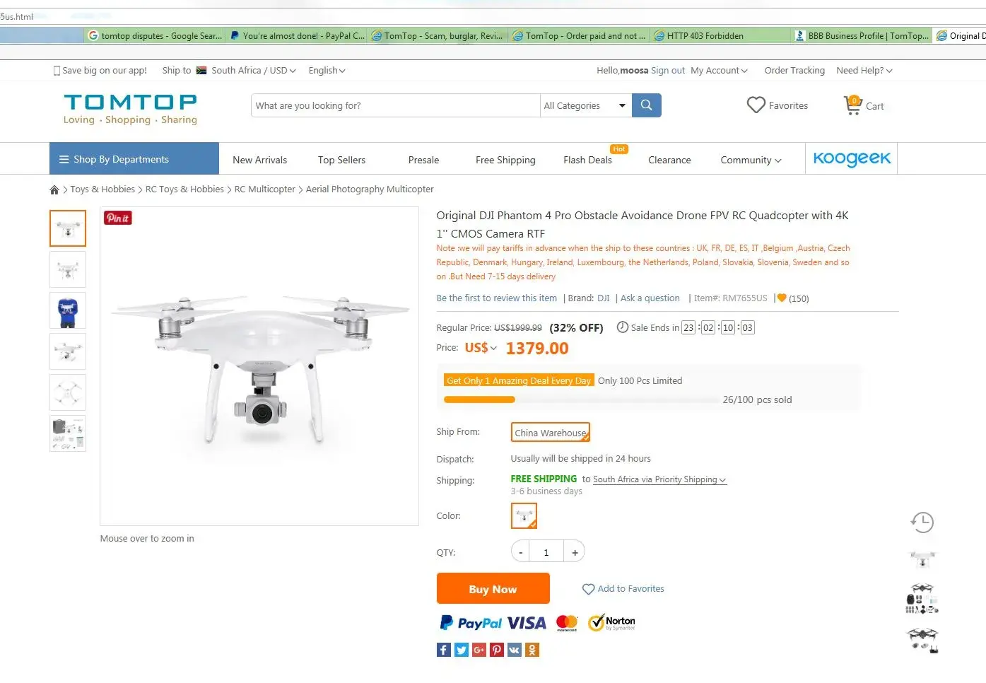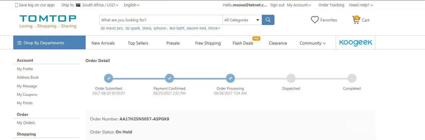 I purchased 2 x Drones from TOMTOP which stated free Shipping to South Africa. I paid via Paypal $2700 . I then after 3 days see that my order is on hold with payment received.I sent many emails to the company with no response.