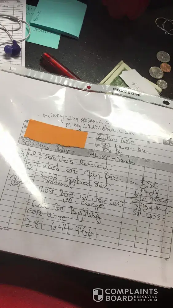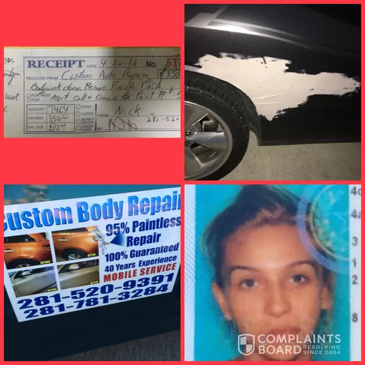 2004 South Mason Road, Katy, TX 77450 by a guy named Nick Costello and his wife named Stephanie Sara Costello saying they could fix the dent in my 2015 challenger. Nick Costello supposedly pulled the dent out then covered it with bondo and was suppose to finish sanding and painting my vehicle. His wife (Stephanie Sara Costello) was suppose to contact me about completing the rest of the work on my car, but has not called me. I called her cell, but no one answered... Then tried calling her cell again and her "mother-in law" answered and said the paint was on back order, if this was the case she should of contacted me and explained what was going on, very unprofessional... Then she said she would have you or nick return my phone call, but I still haven't heard back from Stephan Sara Costello or Nick call me back, I still have not heard back from them and now they will not answer on the cell number [protected]. I called the numbers on the sign and one is out of service and the other is someone's personal line... Apparently, they receive calls for this same issue on a regular basis... I sent them a text later saying I need you and nick to complete the sanding and paint job like we agreed... If you are not able to finish the job, then you can simply return my money to me, and I will have someone else do the job. Thanks