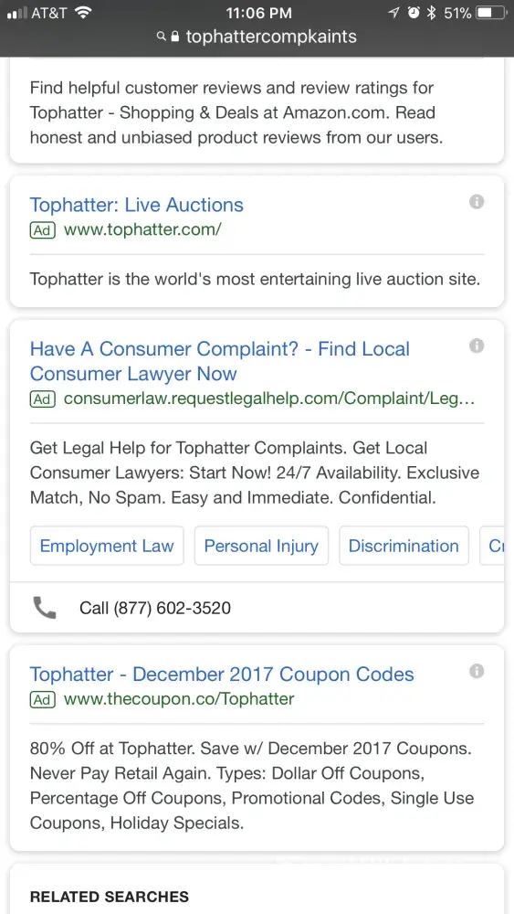 Your Customer Service option is hard to find and worthless. If you really want to provide quality customer support then why is not available on the TopHatter Web site? I found this site by typing in complaints about your company.