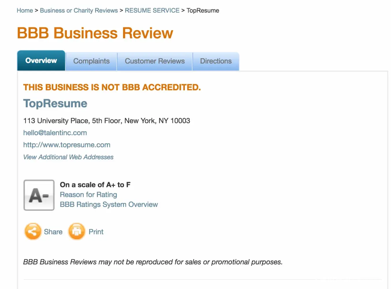 Many of the statements here are inaccurate and completely false. One person mentions that he was subscribed to a service for $39.95 but TopResume does not offer a subscription or a service for less than $129. Another person says that you can't trust them because their BBB rating is an "F" but their actual rating is a "A-". See photo and link http://www.bbb.org/new-york-city/business-reviews/resume-service/topresume-in-new-york-ny-151339