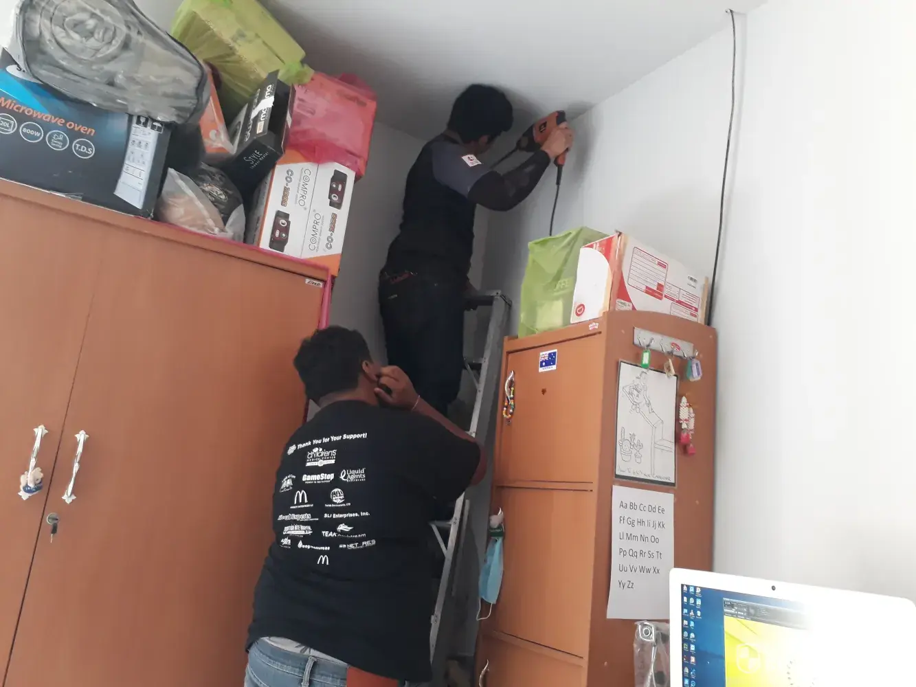 I asked them if they could feed the cable through the plaster ceiling where I already had internet cable from the owner's router. They ignored me and started drilling a hole in the top of the concrete wall. At the same time, they would not allow me to move my stuff from the corner. So the concrete dust was all over my belongings. It would have only taken me 2 minutes to move my stuff. It took me over an hour to clean the mess.Â