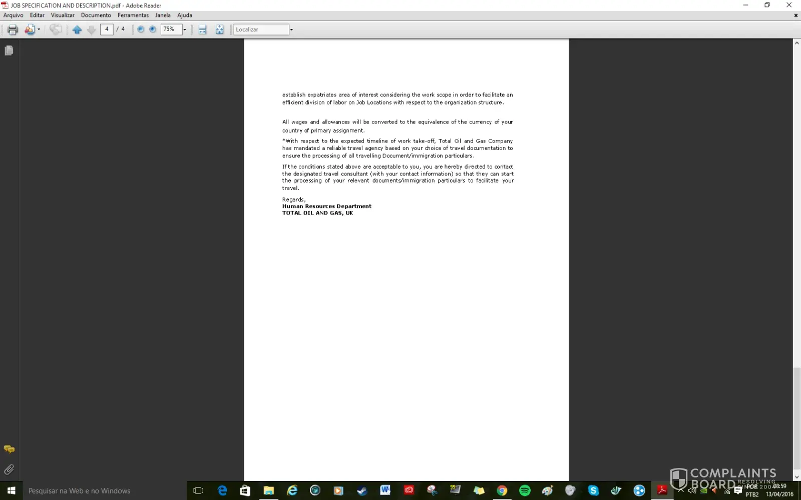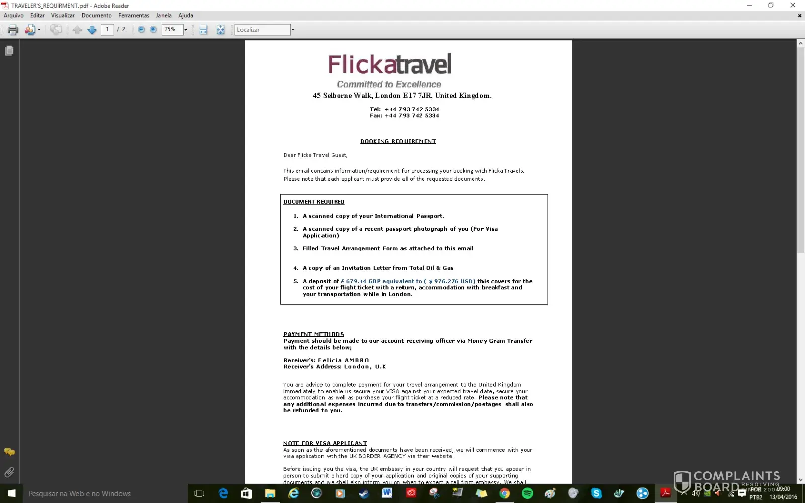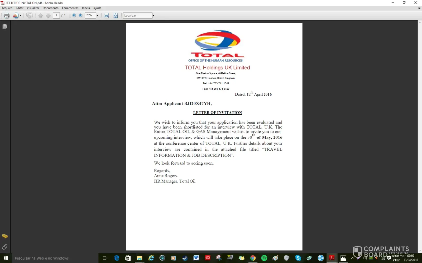I sent my resume through Linkedin for this role on the 25th of August. LinkedIn Se ha recibido tu solicitud. ¡Buena suerte! Hola, Michelle: Hemos recibido tu solicitud para: Administration Manager TOTAL Argentina Yesterday I received this email with some attachments, with the Logo of Total with some instructions to follow to have a face to face interview. Attn: Michelle Couso, Thanks for your interest in the Total UK Family, please note that your resume submitted via LinkedIn has been evaluated and you have been short listed for Job interview. Please go through the attachments for important details of the invitation. We look forward to seeing you soon. Regards, Engr. Daniel McBrynt (Human Resource Relation Officer) TOTAL UK I wrote to the travel agency and they sent me this email today with 3 attachments, one for the Uk Visa, one asking me for £ 1.199.87 for travel arrangements. Batch No: 1093/TOT/13/UK Dated: 09/10/2015 Attn: Michelle Couso, Welcome to Crystal Travels Consultancy and Tours, United Kingdom. We confirm the receipt of your mail and the content has been noted. Please note that we have also received a confirmation email from Total as regarding your appointment with them and have been given the go ahead to proceed with your travel arrangement. We advise that you strictly work in line with our arrangement to enable us render quality service to you. We shall be handling Your flight, hotel booking and visa application (Should you be requiring a UK visa). Also, arrangement for your pick-up from Heathrow airport to your Hotel and vice versa, and from your hotel to interview venue and vice versa, will be handled by us. We also understand that visa processing might be stressful and time consuming when applying in your country, but with our help and services, your visa will be issued within a short space of time despite the limited time. We advise that you follow all our instruction and proceedings in order to get your visa in a very short possible time. Download the attached documents, fill the applicable, scan and send back to me as soon as possible to enable us proceed with your travel arrangement. NOTE: If you don't need a UK visa, I advise that you ignore the visa application form and passport photo size section and send every other document. And also note that all travel expenses will be refunded to you on arrival to London by the HR and account department of TOTAL Holdings UK Limited. Please confirm from your end that you have received this email. We hope to hear from you soon. Regards Mr. Christopher Fraser, (Visa Processing, Immigration and Booking Department) Crystal Travels Consultancy and Tours Colliers Green, Cranbrook Kent, TN17 2LS, United Kingdom Tel: +[protected] Tel: +[protected] Fax: +[protected] Email: crystal.[protected]@outlook.com [protected]@crystaltravelandtours.com I will try to contact Total Oil & Gas to inform of this situation because is a very sensitive issue.