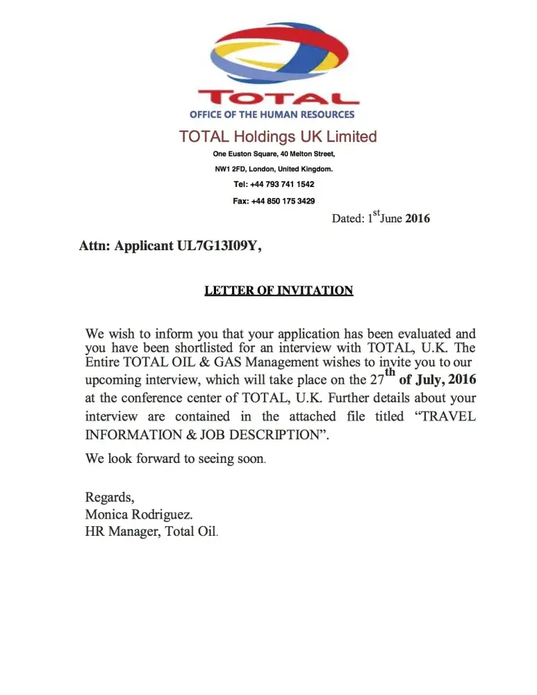 Attn: Dear Applicant, This is to inform you that after proper review of your resume on your job search with TOTAL Oil and Gas, our screening and recruiting board has found you eligible for this vacant position and as such have by this letter invited you for a Face-to-face interview in order to satisfy our conscience before issuing an appointment Letter.