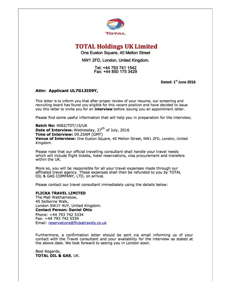 Please note that our official travelling Consultant will be handling your travel needs, including flight tickets, hotel reservations, visa procurement and transfers within UK.Also note that you will be responsible for your travel expenses and only travel expenses made through our travel agency will be refunded to you by TOTAL OIL UK, on arrival. This reason is to have a confirmation of your availability for the interview and show commitment in working with TOTAL.