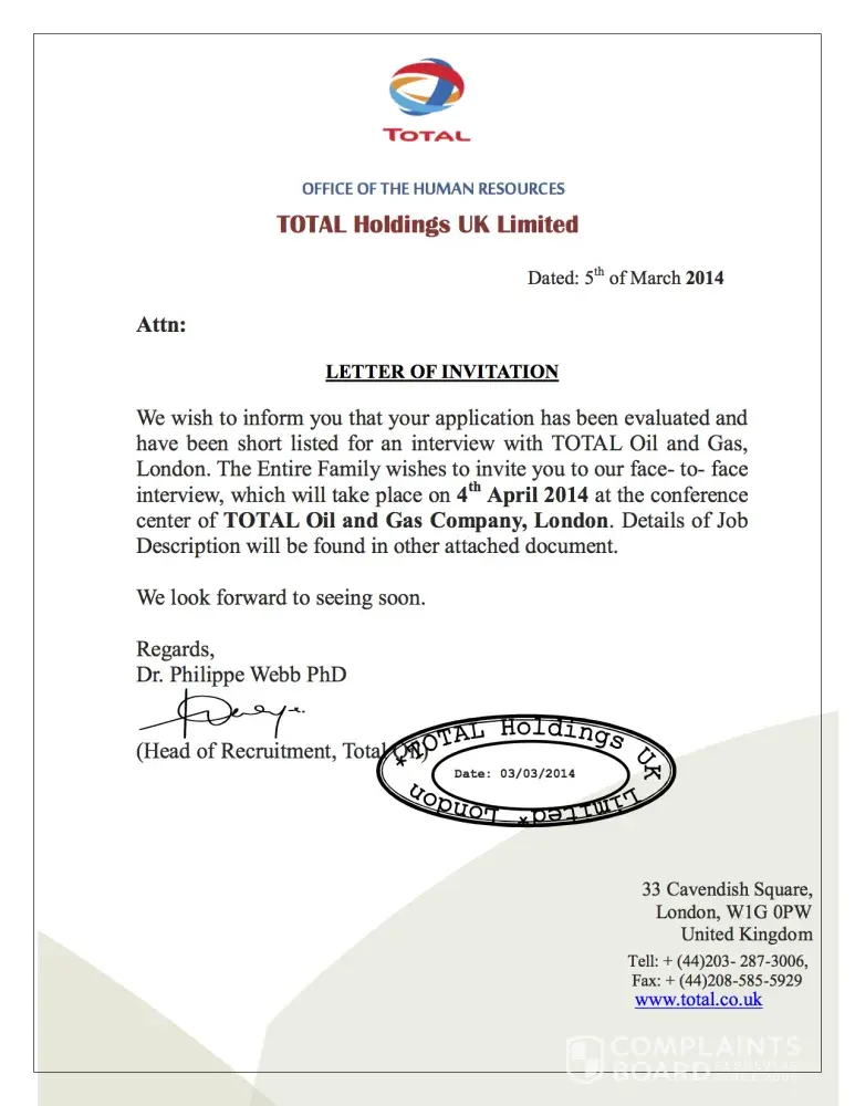 Dear All, I have also received such email. Don't trust them. On the TOTAL UK site there is official recruitment warning message.They also asked money deposit from me.
