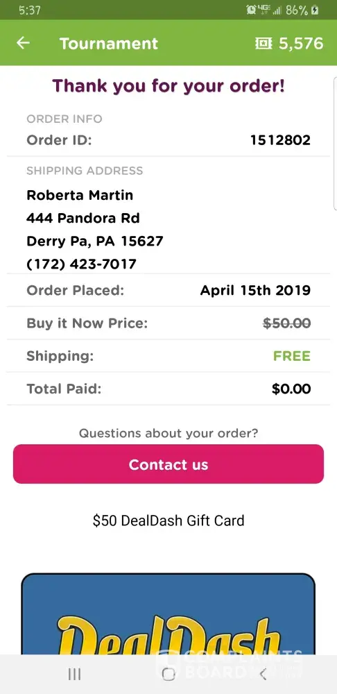 On may 28 2019, i won a $50 dealdash gift card. I messaged customer service to ask about how long it would be until the gift card code would be emailed to me. They responded friendly as can be, I recieved all the confirmation emails etc but no gift card code. Now i cant even play a tournament, and customer service wont even respond. I dont even kow what ive done wrong. I just want my giftcard. I was so pumped to win a tournament. Im sure we can resolve whatever the issue may be. I have screenshots, saved all emails and filed a complaint with the bbb.