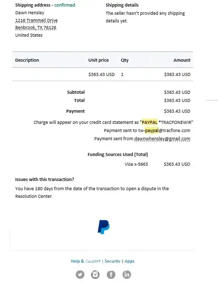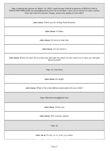 I first contacted Total Wireless on March 1st via chat for questions regarding make a phone purchase. I ended up purchasing two different phones for the total amount of $363.43. I made the payment through paypal. I recieved a confirmation from paypal but not one through Total Wireless. I then contacted them again on March 5th after still not receiving a confirmation, an order number, or any shipping information. I did this via Chat first. I have proof of this chat in pdf form as well as the paypal receipt. I was told by the chat person that I needed to speak to someone in a different department. I then spoke to FIVE different people on 3 separate phone calls. In the initial phone call that was scheduled by the person in the chat, I spoke to two people. I was told by the first person that they could not access that information and I needed to be transferred to a different department. Same story for the second person. Upon being transferred I was disconnected. I then called back two other times, both of which I was told there was no order under my email address or phone number and I would need to be transferred. To which I was transferred two more times and disconnected each time. I feel that I was scammed in a major way. Since I paid through paypal and I have the documentation to prove it, I would like to have this issue resolved by a refund of the full amount that I paid.