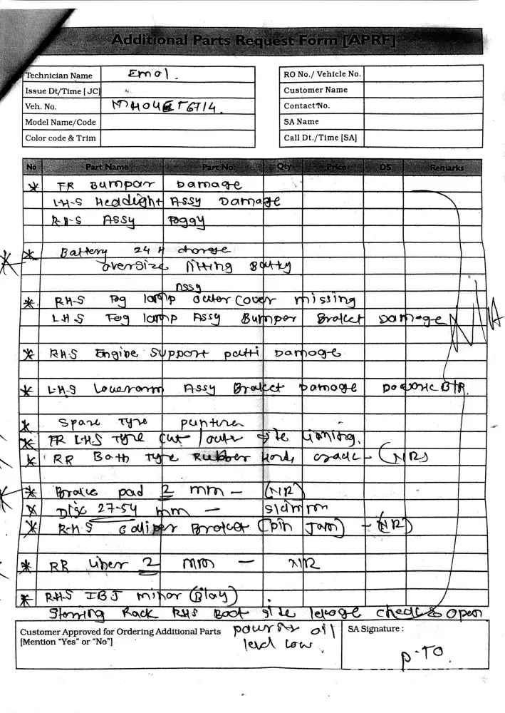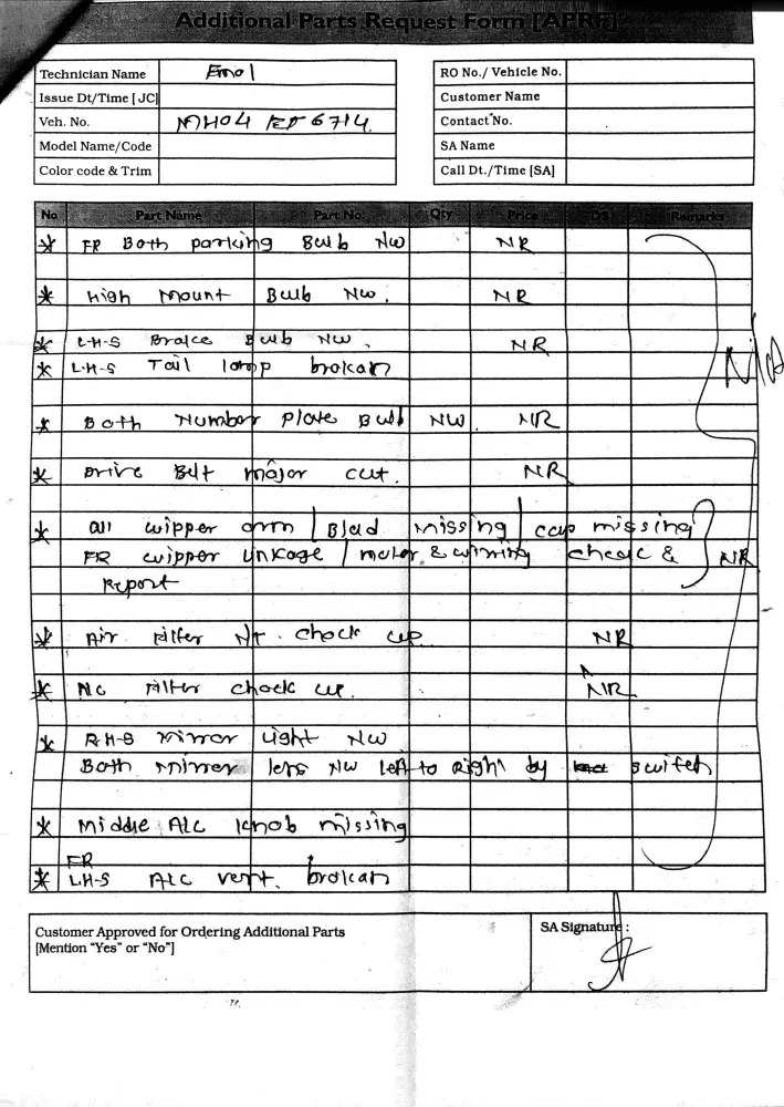 * Inspite of assuring me they did not keep their words and the wiper linkage work was not done, wiper spray Gun was not done, flooring bush was not done, A/C filter was fully chocked but not cleaned or replaced, air filter was fully chocked and not cleaned or replaced. Left rear tyre one bold was broken while fitting the glass they had broken the A/C grill which was not fixed by them.