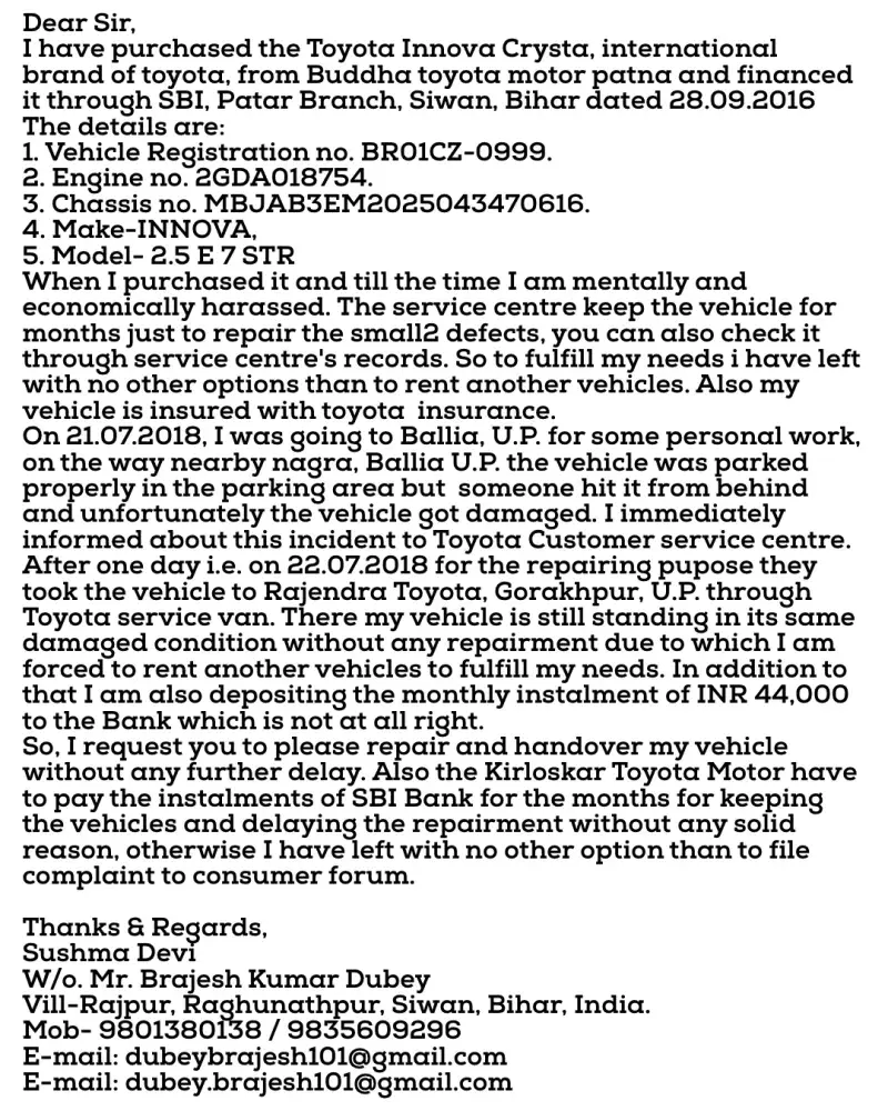 So, I request you to please repair and handover my vehicle without any further delay. Also the Kirloskar Toyota Motor have to pay the instalments of SBI Bank for the months for keeping the vehicles and delaying the repairment without any solid reason, otherwise I have left with no other option than to file complaint to consumer forum.