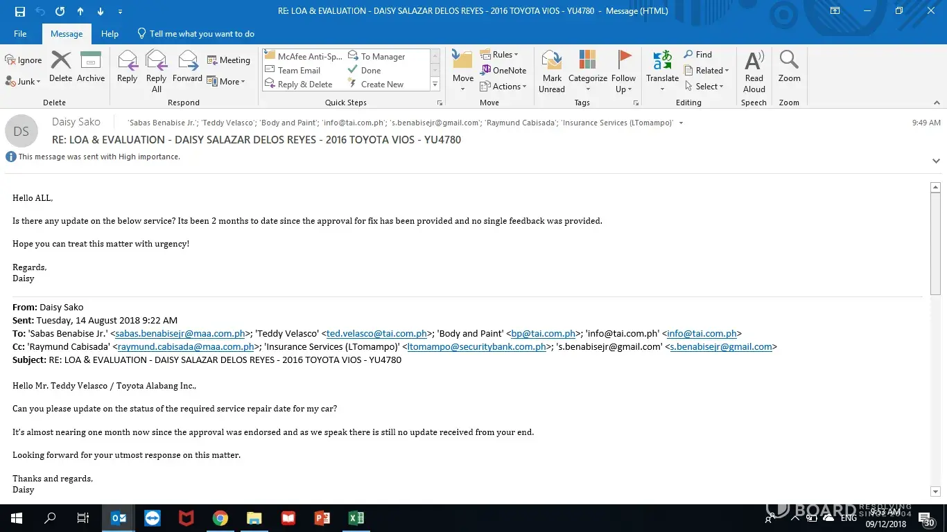 No single feedback provided from Toyota Alabang service repair officers pertaining to LOA and Evaluation provided by Insurance despite a number of followthroughs provided via email. Customer service of said service center is also hard to be contacted.