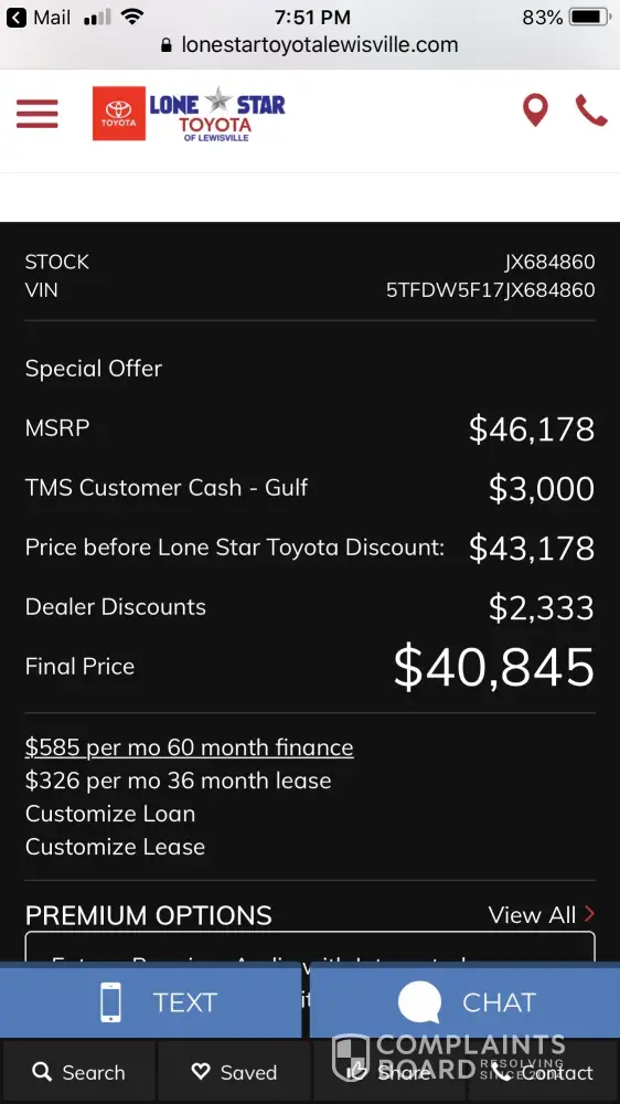 I requested a quote for a new 2018 Tundra SR5 4x4 that had the option I wanted and Lone Star Toyota would not honor what they had quoted. The manager called and said they would honor it but would have to pay for items that were listed on their site under that vehicle description of a cost of $1800. Those items are listed under that vehicle and quote that was sent. I will not buy a vehicle from that dealership. I'm curious as to how many other people have been ripped off. They said that the wheels, tires and leveling kit wasn't put on the site but they advertised this vehicle. Bad business