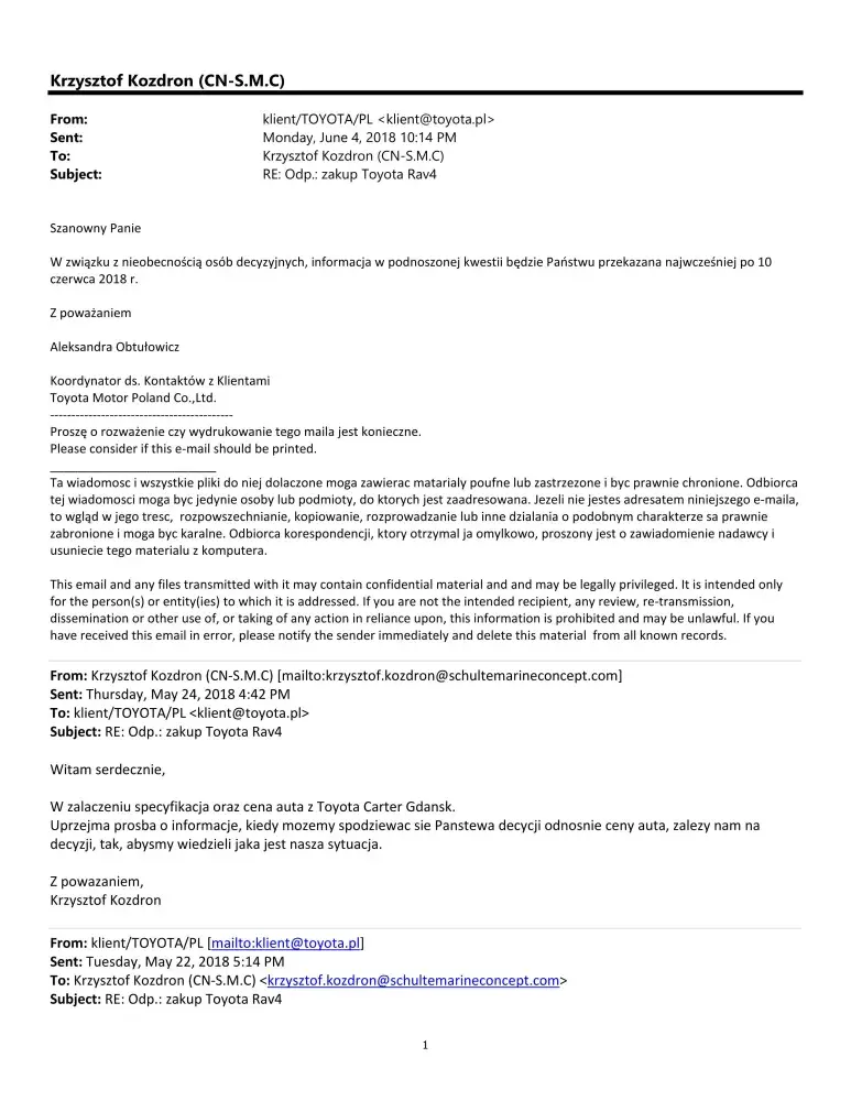 On 4th June Toyota Motor Poland advised that "due to the absence of decision making persons the reply will be provided earliest after 10th of June 2018."